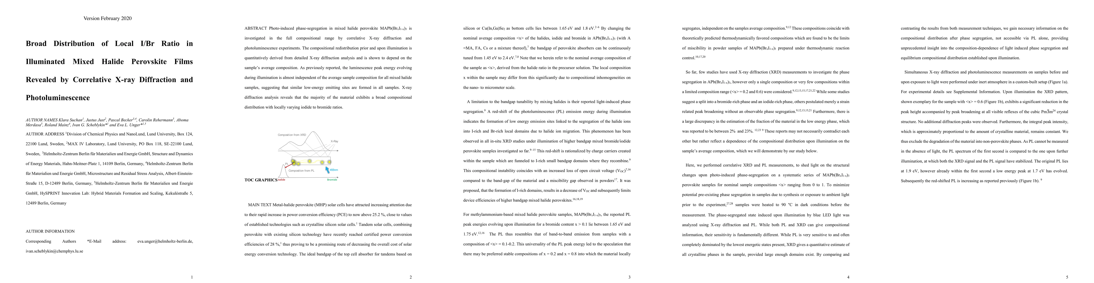 This study investigates photo-induced phase segregation in mixed halide perovskite films using correlative X-ray diffraction and photoluminescence, revealing a broad distribution of local I/Br ratios under illumination. The findings highlight the compositional variability and potential for improved stability in mixed halide perovskites.