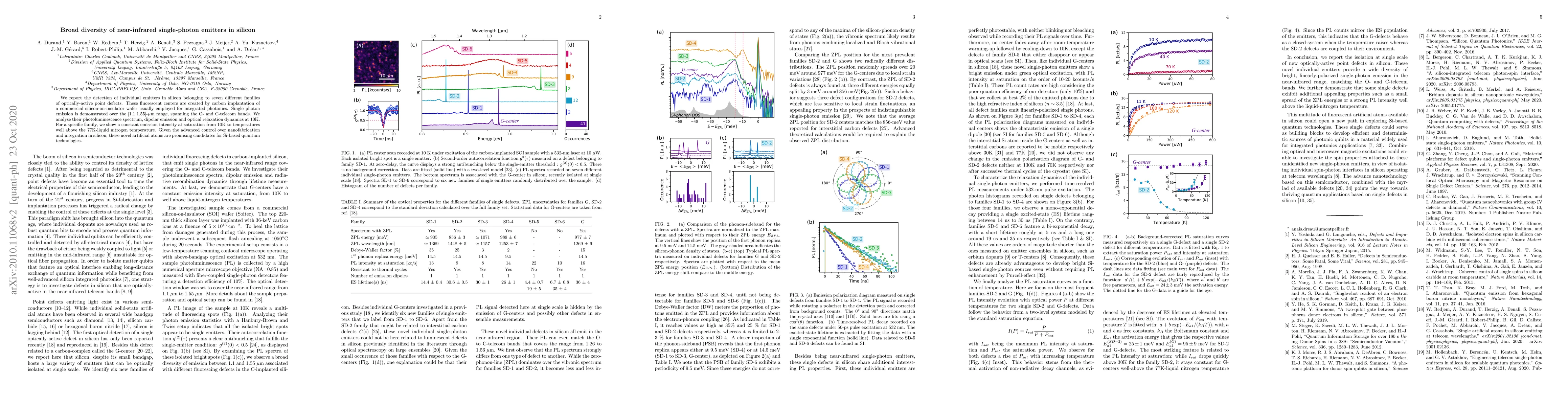 This paper reports the detection of seven families of optically-active point defects in silicon, created via carbon implantation, which emit single photons in the near-infrared range. These emitters show stable performance across a wide temperature range, making them promising for silicon-based quantum technologies.
