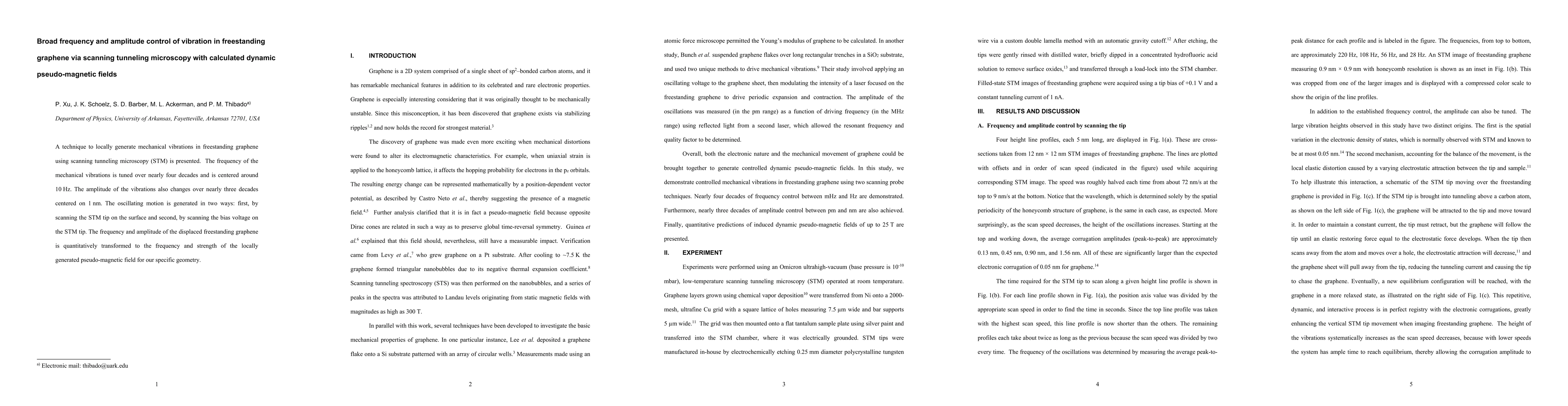 This paper details a technique using scanning tunneling microscopy (STM) to generate and control mechanical vibrations in freestanding graphene, achieving frequency tuning over four decades and amplitude control over three decades. The vibrations correspond to dynamically generated pseudo-magnetic fields.