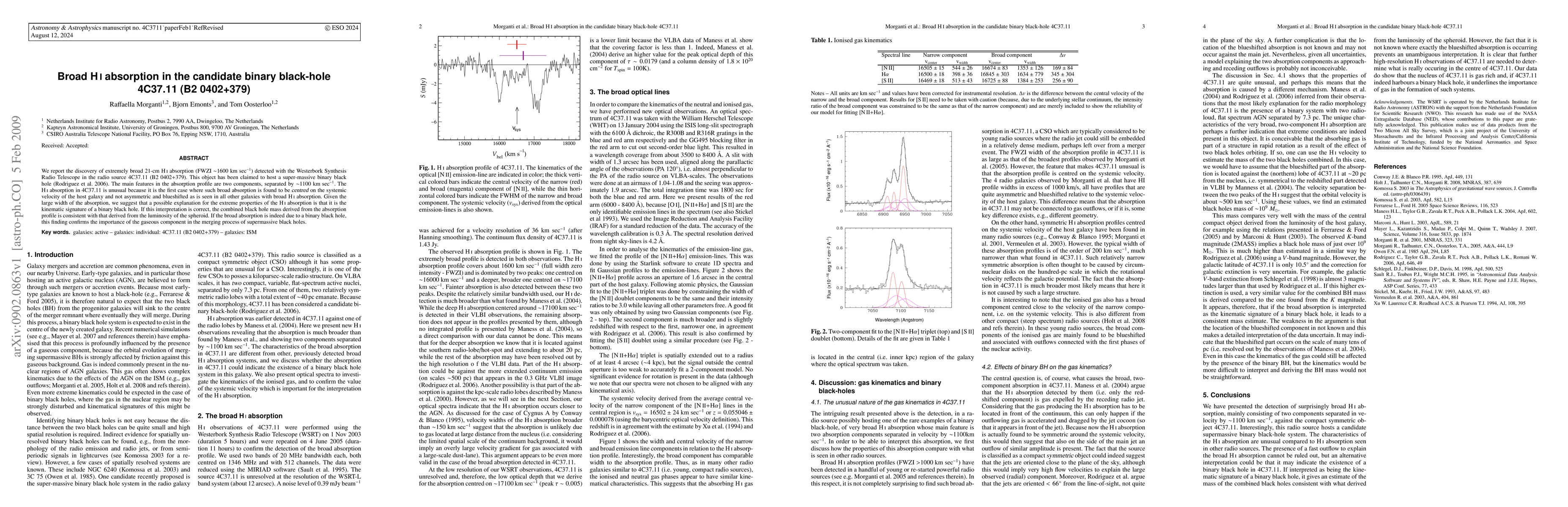The paper reports the discovery of extremely broad HI absorption in the radio source 4C37.11, suggesting it may host a supermassive binary black hole. The absorption profile, centered on the systemic velocity, indicates a possible kinematic signature of a merging black hole system.