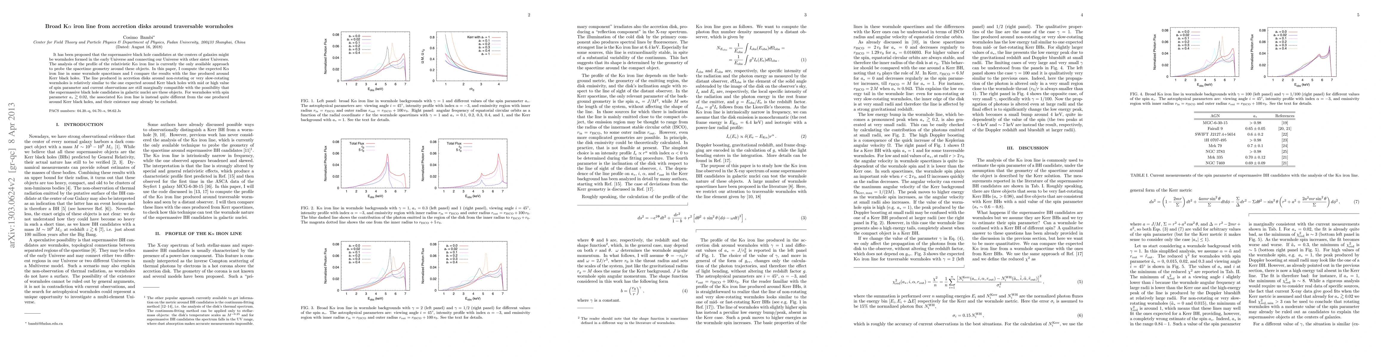This paper investigates the relativistic K$\alpha$ iron line from accretion disks around traversable wormholes, comparing it with lines from Kerr black holes. It finds that non-rotating or slowly-rotating wormholes produce similar lines to high-spin Kerr black holes, while rapidly spinning wormholes yield distinct lines, potentially excluding their existence based on current observations.