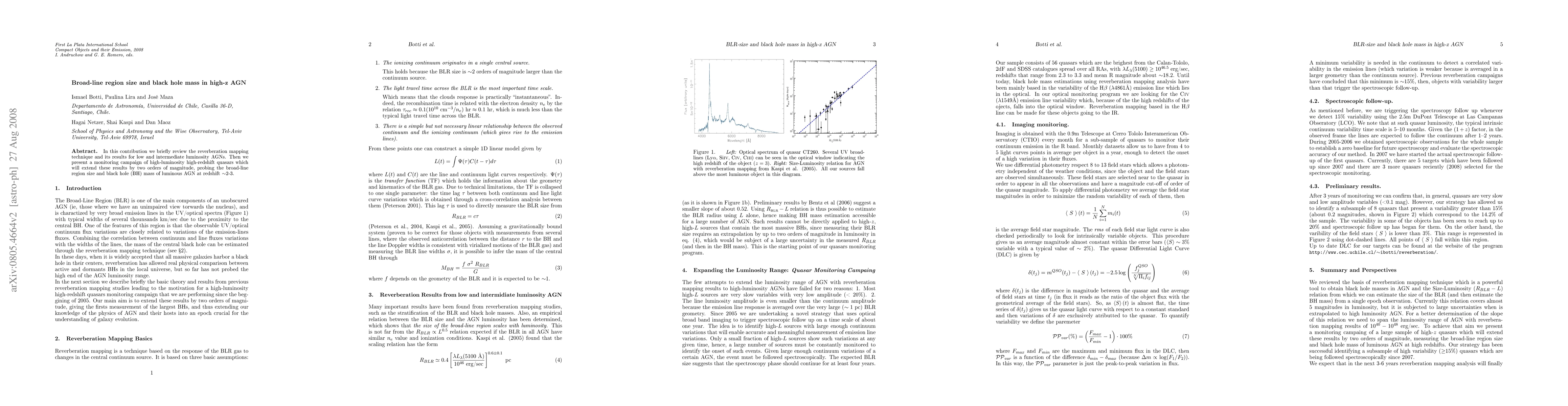 In this contribution we briefly review the reverberation mapping technique and its results for low and intermidiate luminosity AGNs. Then we present a monitoring campaign of high-luminosity high-redshift quasars which will extend these results by two orders of magnitude, probing the broad-line region size and black hole (BH) mass of luminous AGN at redshift ~2-3.