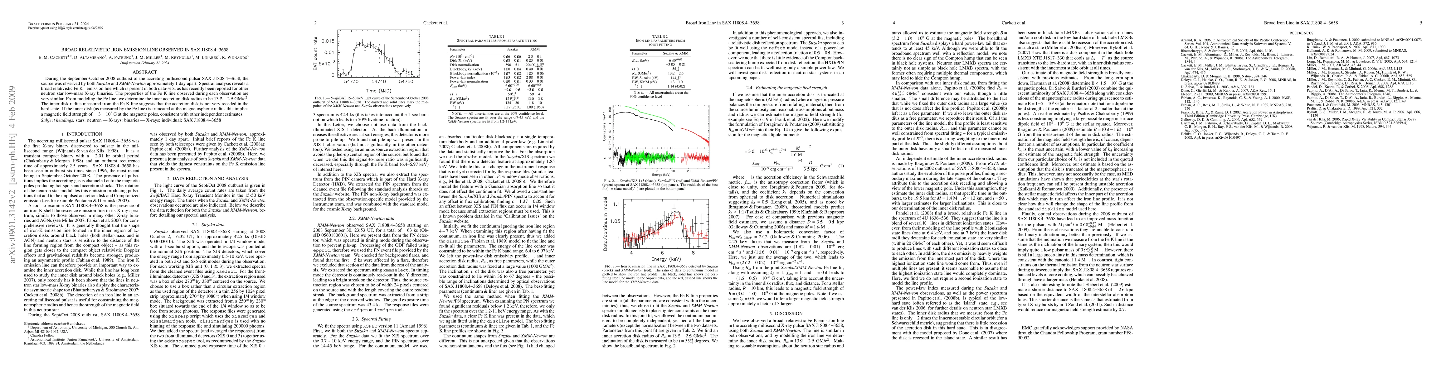 During the September-October 2008 outburst of the accreting millisecond pulsar SAX J1808.4-3658, the source was observed by both Suzaku and XMM-Newton approximately 1 day apart. Spectral analysis reveals a broad relativistic Fe K-alpha emission line which is present in both data-sets, as has recently been reported for other neutron star low-mass X-ray binaries. The properties of the Fe K line observed during each observation are very similar. From modeling the Fe line, we determine the inner accretion disk radius to be 13.2 +/- 2.5 GM/c^2. The inner disk radius measured from the Fe K line suggests that the accretion disk is not very receded in the island state. If the inner disk (as measured by the Fe line) is truncated at the magnetospheric radius this implies a magnetic field strength of ~3E8 G at the magnetic poles, consistent with other independent estimates.
