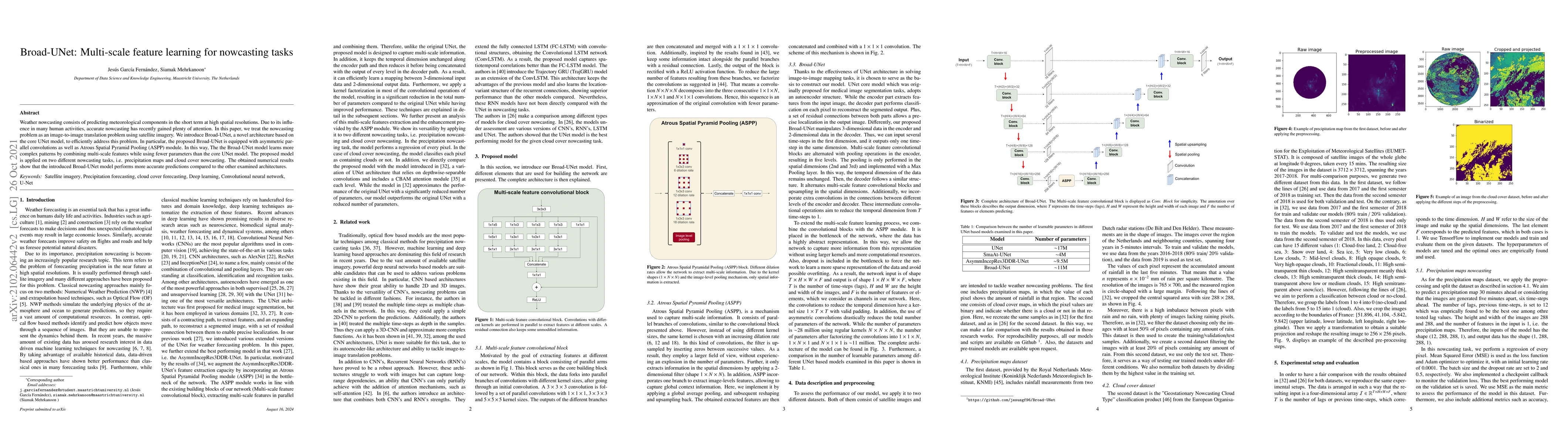 Broad-UNet is a novel architecture based on UNet for high-resolution weather nowcasting using satellite imagery, leveraging multi-scale feature learning through asymmetric parallel convolutions and ASPP to achieve more accurate predictions with fewer parameters. The model outperforms other architectures in tasks like precipitation and cloud cover nowcasting.