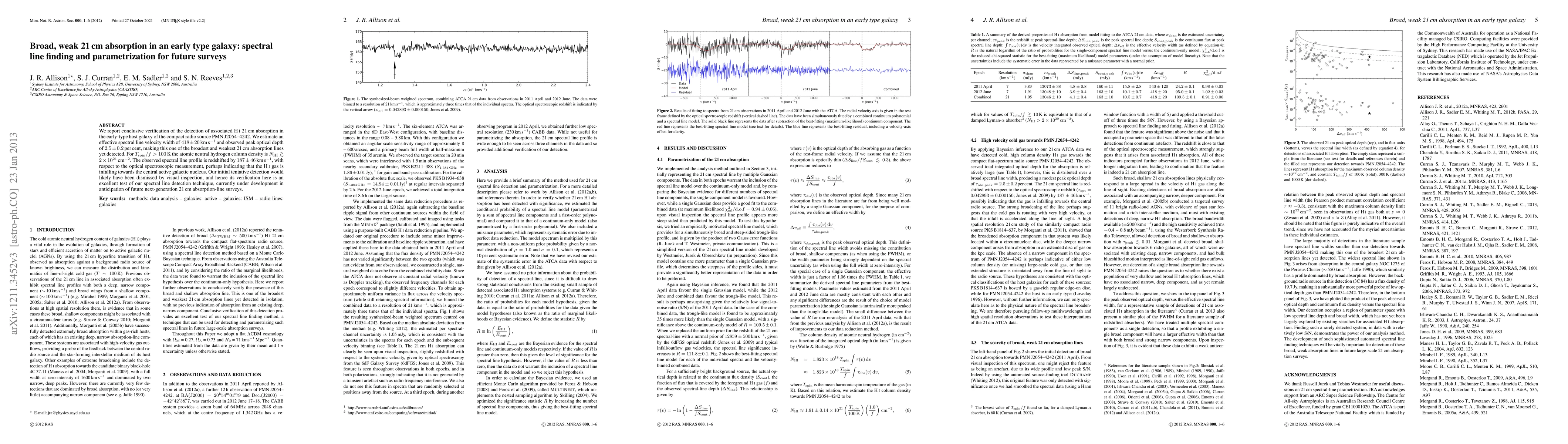 We report conclusive verification of the detection of associated HI 21 cm absorption in the early-type host galaxy of the compact radio source PMNJ2054-4242. We estimate an effective spectral line velocity width of 418 +/- 20 km s^{-1} and observed peak optical depth of 2.5 +/- 0.2 per cent, making this one of the broadest and weakest 21 cm absorption lines yet detected. For T_{spin}/f > 100 K the atomic neutral hydrogen column density is N_{HI} > 2 x 10^{21} cm^{-2}. The observed spectral line profile is redshifted by 187 +/- 46 km s^{-1}, with respect to the optical spectroscopic measurement, perhaps indicating that the HI gas is infalling towards the central active galactic nucleus. Our initial tentative detection would likely have been dismissed by visual inspection, and hence its verification here is an excellent test of our spectral line detection technique, currently under development in anticipation of future next-generation 21 cm absorption-line surveys.