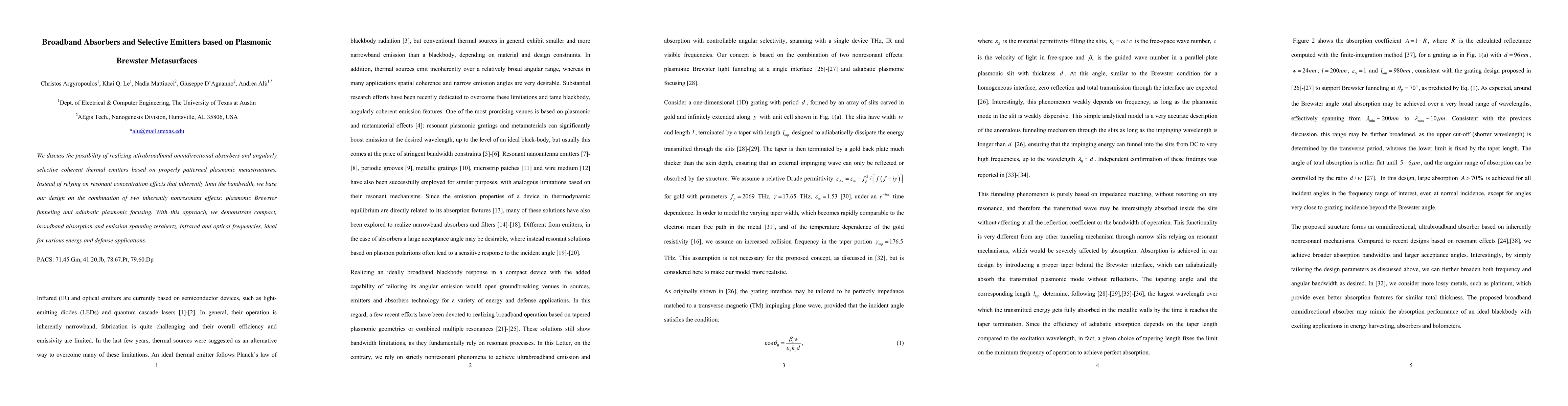 This paper proposes ultrabroadband omnidirectional absorbers and angularly selective thermal emitters using plasmonic metasurfaces, leveraging nonresonant plasmonic Brewster funneling and adiabatic focusing instead of resonant effects. The design enables compact, broadband performance across terahertz, infrared, and optical frequencies for energy and defense applications.