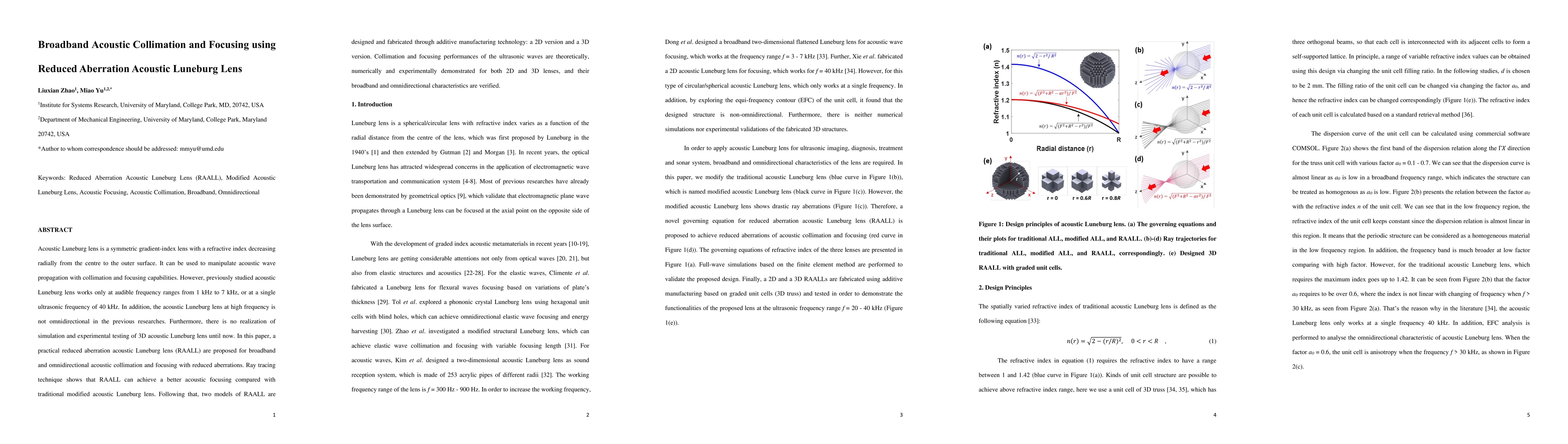 This paper proposes a practical reduced aberration acoustic Luneburg lens (RAALL) for broadband and omnidirectional acoustic collimation and focusing, demonstrating superior performance over traditional lenses. The RAALL is both theoretically and experimentally validated through additive manufacturing for both 2D and 3D models.
