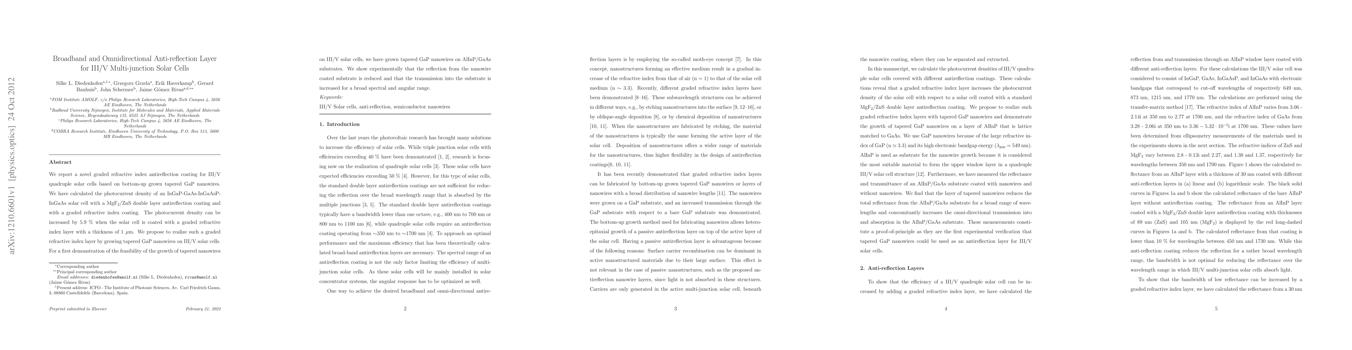 This paper introduces a novel graded refractive index antireflection coating using tapered GaP nanowires for III/V multi-junction solar cells, which increases photocurrent density by 5.9% and demonstrates reduced reflection and improved transmission over a broad spectral and angular range.