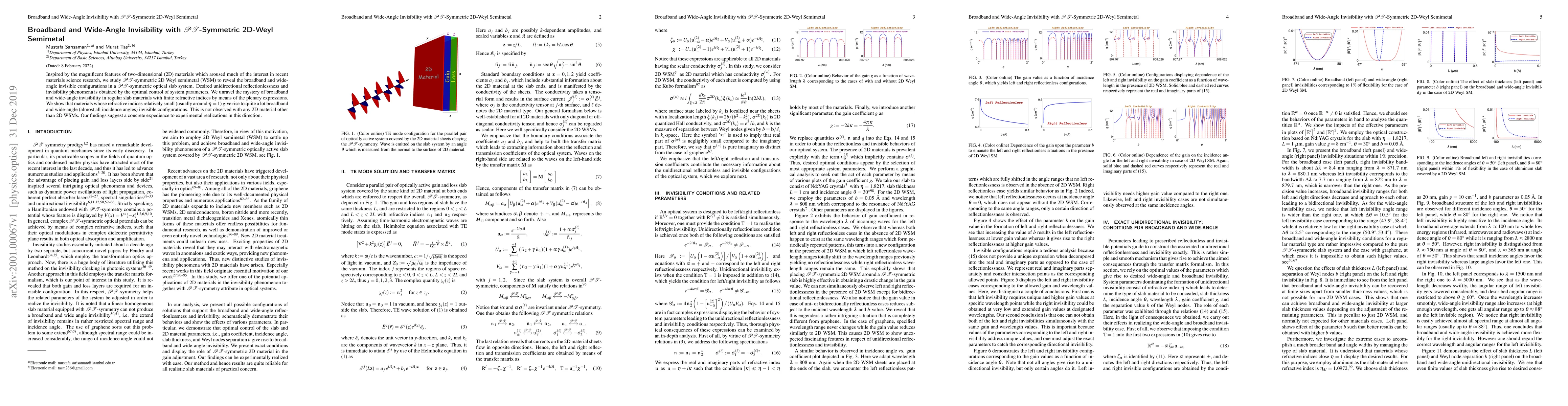 Inspired by the magnificent features of two-dimensional (2D) materials which aroused much of the interest in recent materials science research, we study PT-symmetric 2D Weyl semimetal (WSM) to reveal the broadband and wide-angle invisible configurations in a PT-symmetric optical slab system. Desired unidirectional reflectionlessness and invisibility phenomena is obtained by the optimal control of system parameters. We unravel the mystery of broadband and wide-angle invisibility in regular slab materials with finite refractive indices by means of the plenary expressions. We show that materials whose refractive indices relatively small (usually around $\eta =1$) give rise to quite a lot broadband and wide-angle (almost all incidence angles) invisible configurations. This is not observed with any 2D material other than 2D WSMs. Our findings suggest a concrete expedience to experimental realizations in this direction.