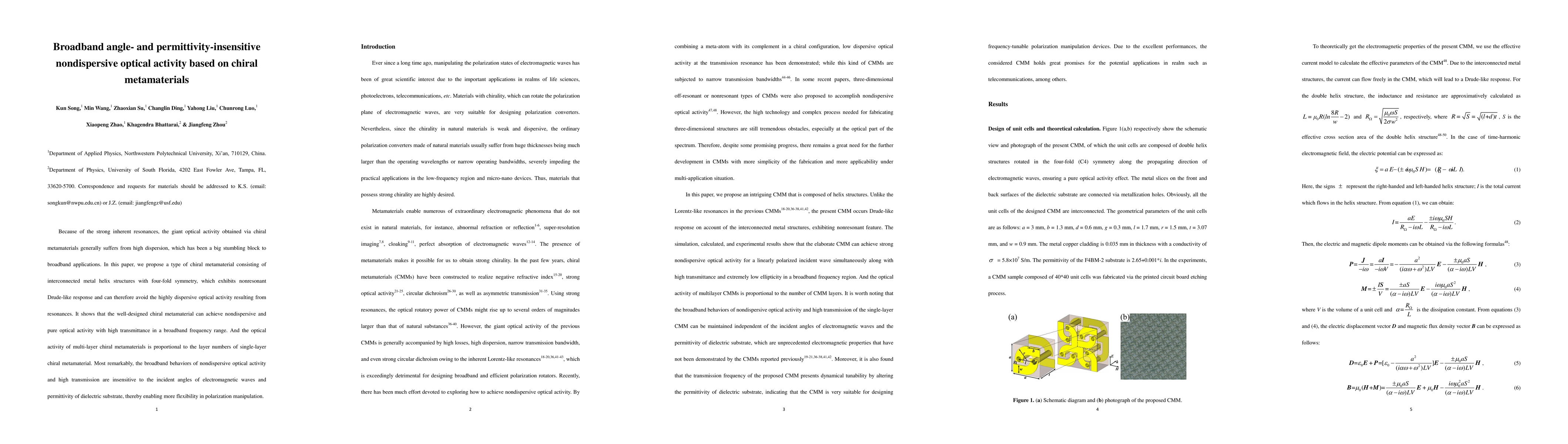 This paper presents a broadband, angle- and permittivity-insensitive nondispersive optical activity using chiral metamaterials composed of interconnected metal helix structures. The proposed design achieves high transmittance and pure optical activity across a wide frequency range without the dispersive effects typically associated with chiral metamaterials.