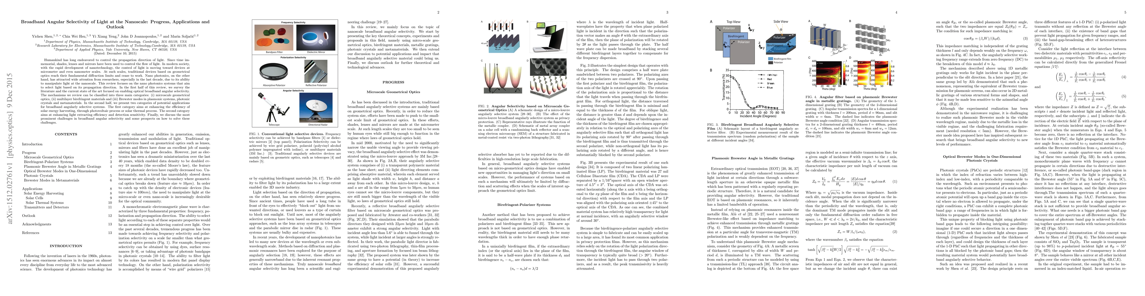 This paper reviews the progress in nano photonics for achieving broadband angular selectivity of light at nanoscale, categorizing mechanisms into microscale optics, multilayer materials, and plasmonic systems. It explores applications in solar energy and light efficiency, and discusses challenges and future prospects.