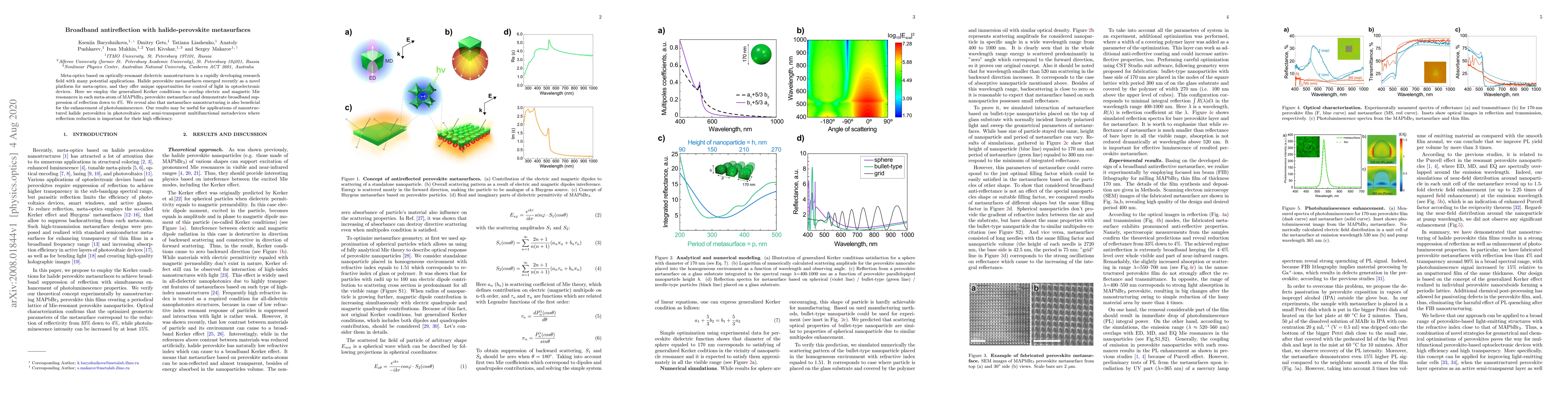 This paper demonstrates the use of halide perovskite metasurfaces to achieve broadband antireflection through the manipulation of electric and magnetic Mie resonances, achieving reflection suppression down to 4%. The study also highlights the metasurface’s potential for enhancing photoluminescence, suggesting applications in photovoltaics and multifunctional metadevices.