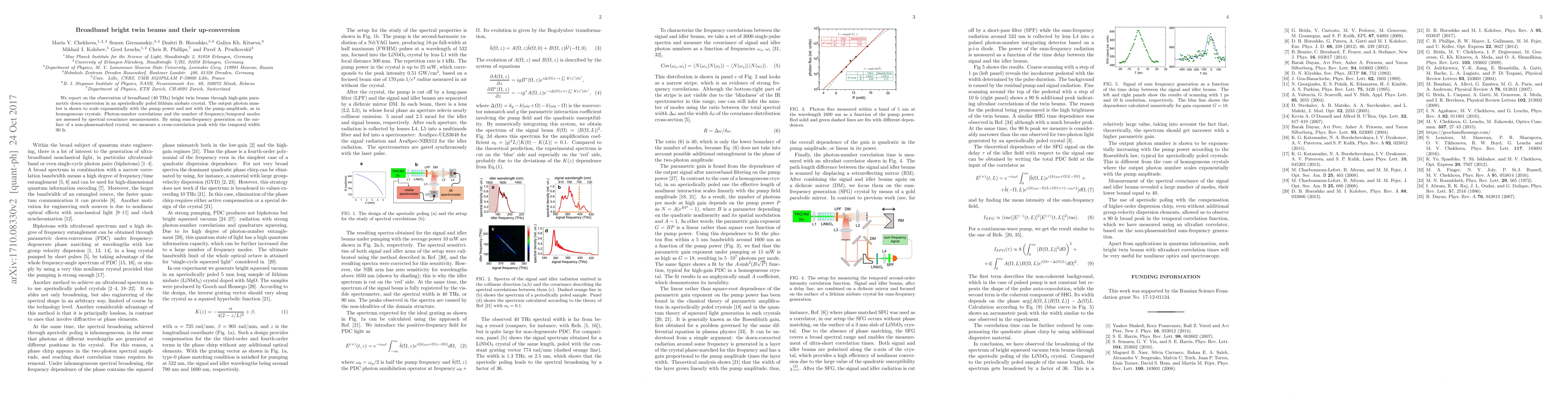 This paper reports on the generation of broadband twin beams via high-gain parametric down-conversion in an aperiodically poled lithium niobate crystal, demonstrating exponential scaling of photon number with pump power. The study also measures photon-number correlations and assesses frequency/temporal modes using spectral covariance, revealing a 90 fs cross-correlation peak via sum-frequency generation.