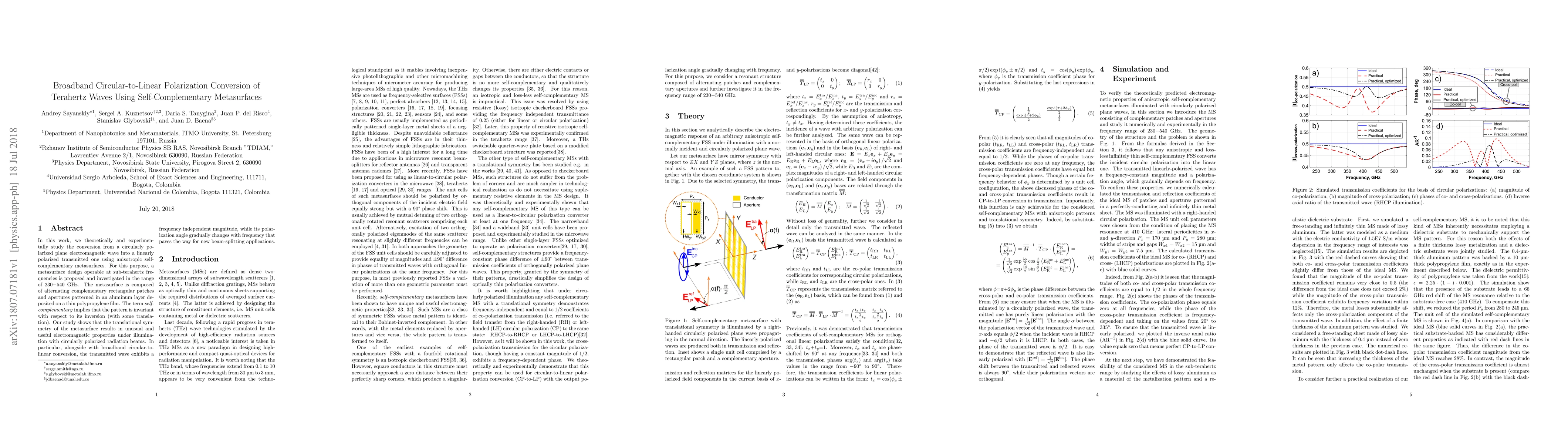 This paper investigates the design and implementation of self-complementary metasurfaces for broadband conversion of circularly polarized terahertz waves into linearly polarized waves, demonstrating frequency-independent magnitude and tunable polarization angle. The metasurface, composed of complementary rectangular patches and apertures, exhibits unique electromagnetic properties due to its translational symmetry.
