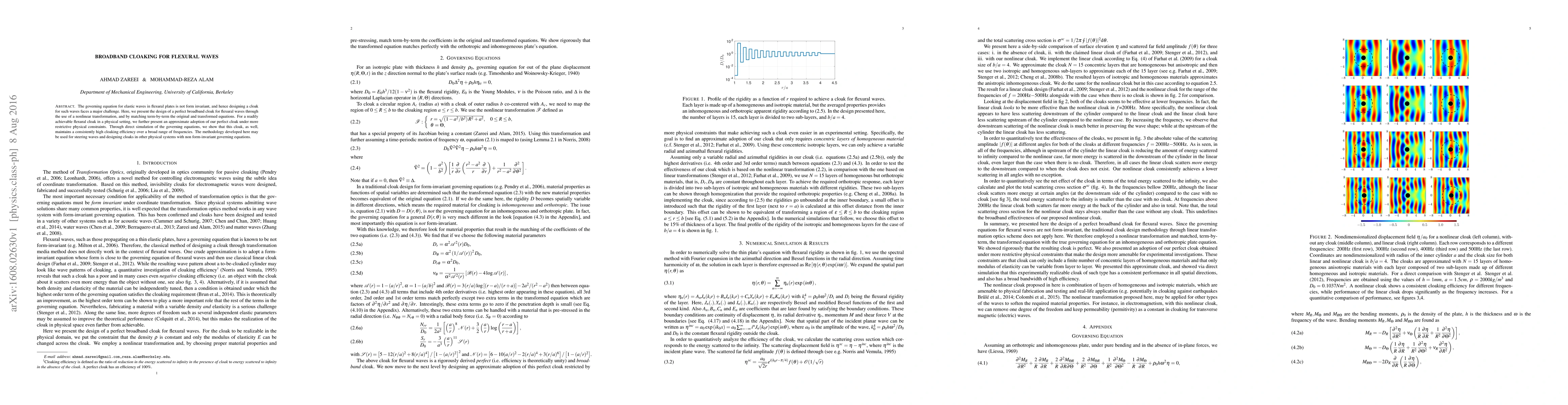 The governing equation for elastic waves in flexural plates is not form invariant, and hence designing a cloak for such waves faces a major challenge. Here, we present the design of a perfect broadband cloak for flexural waves through the use of a nonlinear transformation, and by matching term-by-term the original and transformed equations. For a readily achievable flexural cloak in a physical setting, we further present an approximate adoption of our perfect cloak under more restrictive physical constraints. Through direct simulation of the governing equations, we show that this cloak, as well, maintains a consistently high cloaking efficiency over a broad range of frequencies. The methodology developed here may be used for steering waves and designing cloaks in other physical systems with non form-invariant governing equations.