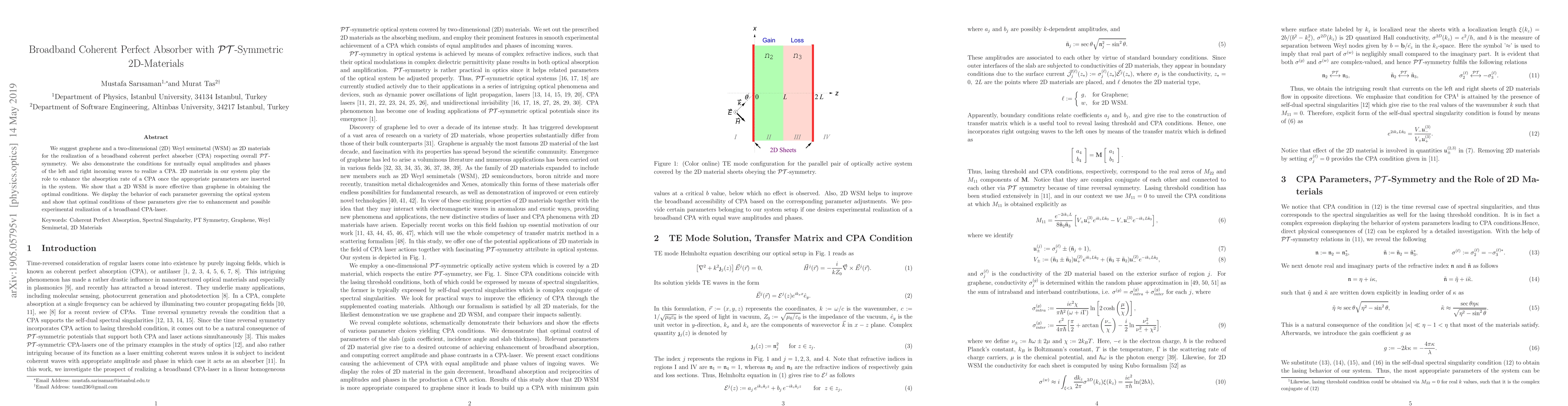 We suggest graphene and a two-dimensional (2D) Weyl semimetal (WSM) as 2D materials for the realization of a broadband coherent perfect absorber (CPA) respecting overall PT-symmetry. We also demonstrate the conditions for mutually equal amplitudes and phases of the left and right incoming waves to realize a CPA. 2D materials in our system play the role to enhance the absorption rate of a CPA once the appropriate parameters are inserted in the system. We show that a 2D WSM is more effective than graphene in obtaining the optimal conditions. We display the behavior of each parameter governing the optical system and show that optimal conditions of these parameters give rise to enhancement and possible experimental realization of a broadband CPA-laser.