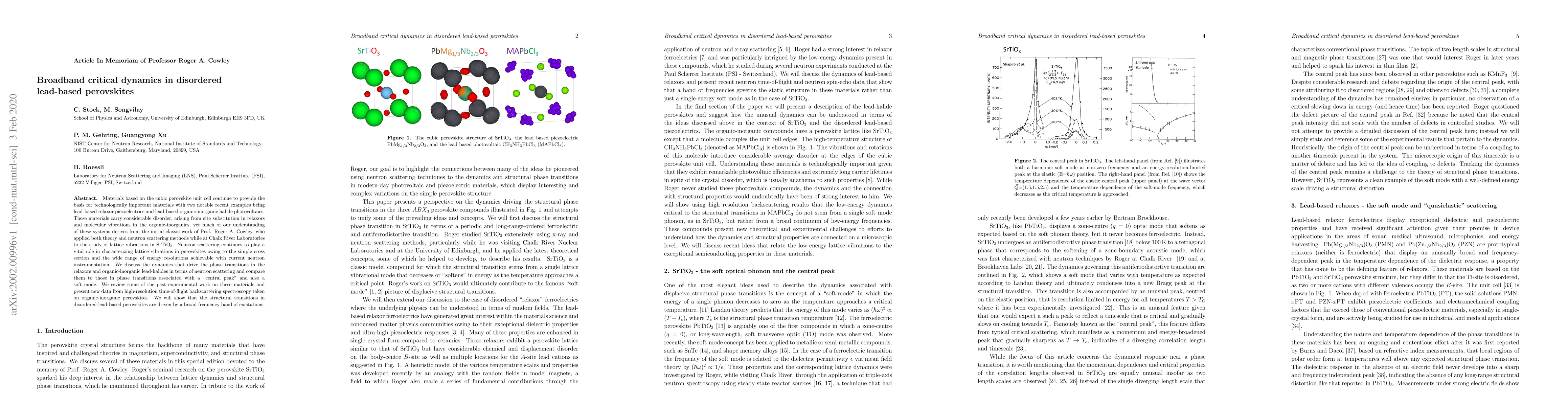 This paper investigates the broadband critical dynamics in disordered lead-based perovskites using neutron scattering techniques, revealing the broad frequency band of excitations driving structural transitions in these materials. It compares these dynamics to phase transitions associated with a "central peak" and soft mode, presenting new data from high-resolution spectroscopy.
