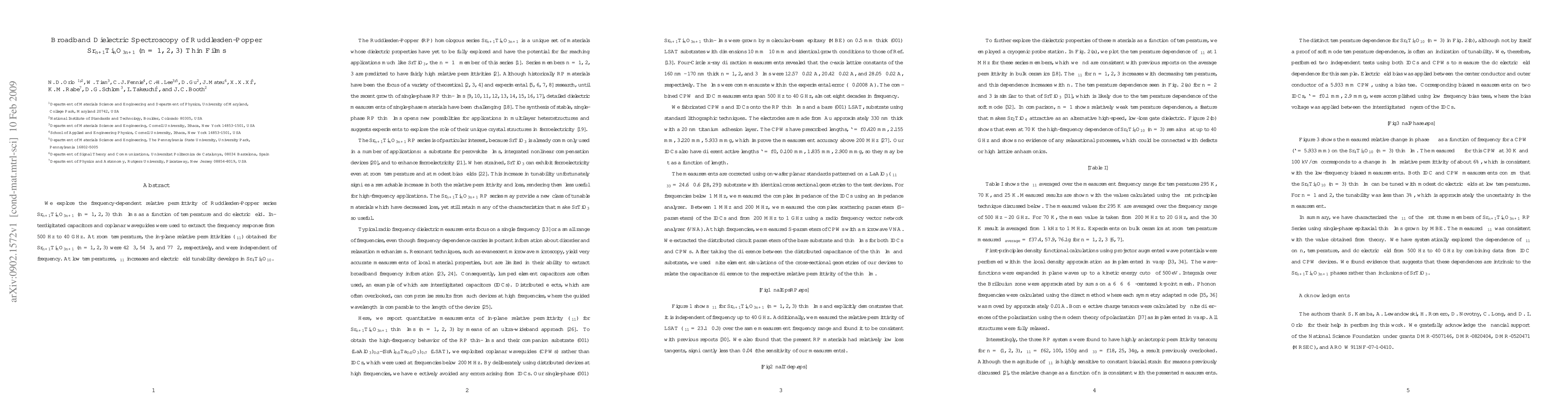 We explore the frequency-dependent relative permittivity of Ruddlesden-Popper series Sr(n+1)Ti(n)O(3n+1) (n =1,2,3) thin films as a function of temperature and dc electric field. Interdigitated capacitors and coplanar waveguides were used to extract the frequency response from 500 Hz to 40 GHz. At room temperature, the in-plane relative permittivities obtained for Sr(n+1)Ti(n)O(3n+1) (n =1,2,3) were 42+/-3, 54+/-3, and 77+/-2, respectively, and were independent of frequency. At low temperatures, permittivity increases and electric field tunability develops in Sr(4)Ti(3)O(10).