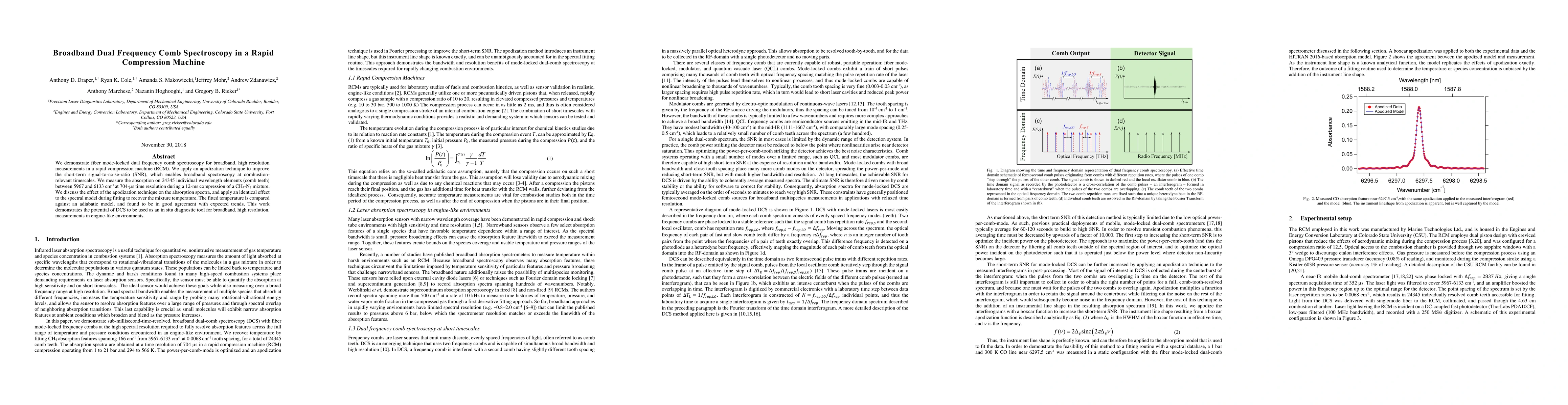 We demonstrate fiber mode-locked dual frequency comb spectroscopy for broadband, high resolution measurements in a rapid compression machine (RCM). We apply an apodization technique to improve the short-term signal-to-noise-ratio (SNR), which enables broadband spectroscopy at combustion-relevant timescales. We measure the absorption on 24345 individual wavelength elements (comb teeth) between 5967 and 6133 cm-1 at 704 microsecond time resolution during a 12-ms compression of a CH4-N2 mixture. We discuss the effect of the apodization technique on the absorption spectra, and apply an identical effect to the spectral model during fitting to recover the mixture temperature. The fitted temperature is compared against an adiabatic model, and found to be in good agreement with expected trends. This work demonstrates the potential of DCS to be used as an in situ diagnostic tool for broadband, high resolution, measurements in engine-like environments.