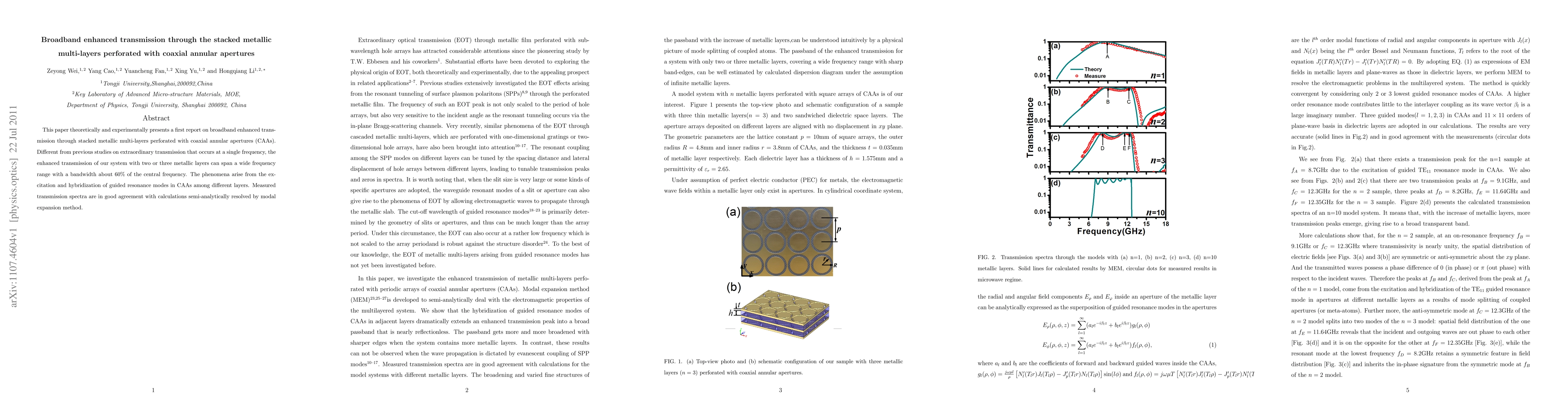 This paper reports on broadband enhanced transmission through stacked metallic multi-layers with coaxial annular apertures, achieving a wide frequency range with a bandwidth of 60% of the central frequency, driven by guided resonance modes. Experimental results align well with semi-analytical calculations.