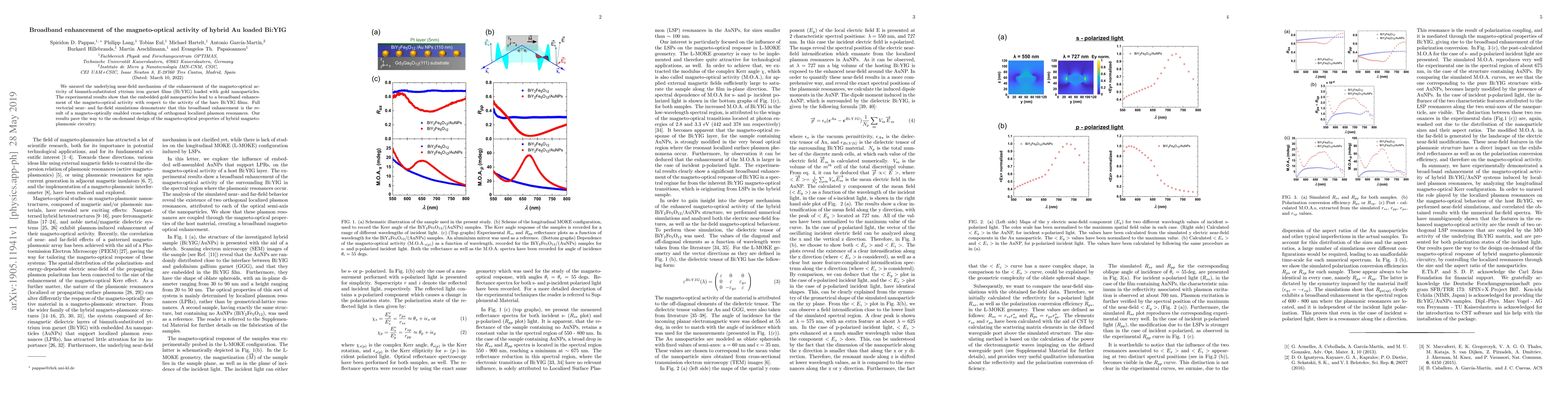 We unravel the underlying near-field mechanism of the enhancement of the magneto-optical activity of bismuth-substituted yttrium iron garnet films (Bi:YIG) loaded with gold nanoparticles. The experimental results show that the embedded gold nanoparticles lead to a broadband enhancement of the magneto-optical activity with respect to the activity of the bare Bi:YIG films. Full vectorial near- and far-field simulations demonstrate that this broadband enhancement is the result of a magneto-optically enabled cross-talking of orthogonal localized plasmon resonances. Our results pave the way to the on-demand design of the magneto-optical properties of hybrid magneto-plasmonic circuitry.