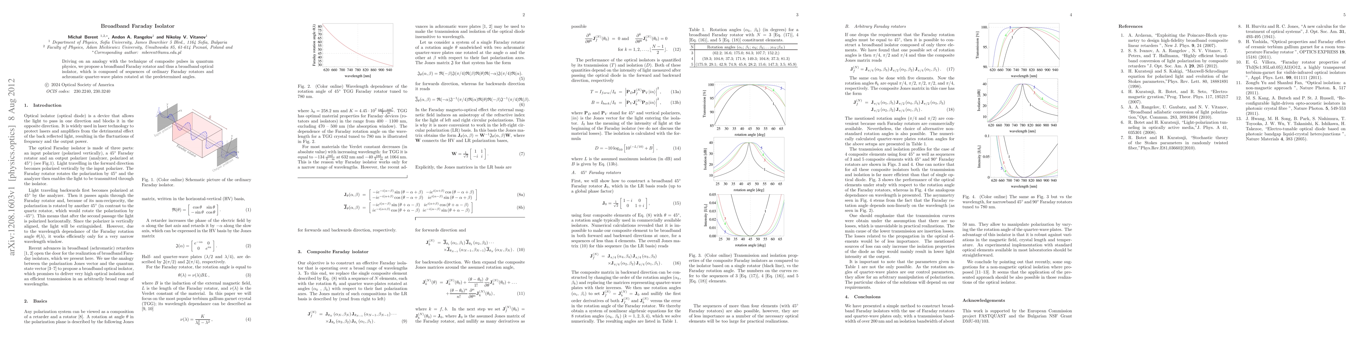 Summary: This paper proposes a broadband Faraday rotator and optical isolator using sequences of ordinary Faraday rotators and achromatic quarter-wave plates, inspired by composite pulse techniques in quantum physics, to achieve wide-range light isolation.