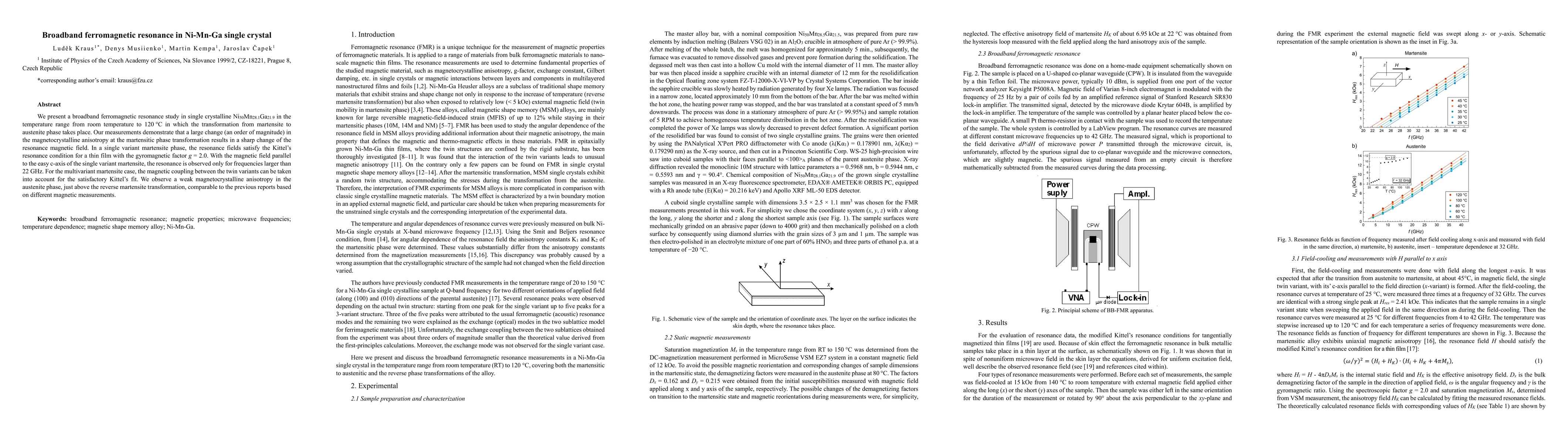 We present a broadband ferromagnetic resonance study in single crystalline Ni$_{50}$Mn$_{28.1}$Ga$_{21.9}$ in the temperature range from room temperature to 120 {\deg}C in which the transformation from martensite to austenite phase takes place. Our measurements demonstrate that a large change (an order of magnitude) in the magnetocrystalline anisotropy at the martensitic phase transformation results in a sharp change of the resonance magnetic field. In a single variant martensite phase, the resonance fields satisfy the Kittel's resonance condition for a thin film with the gyromagnetic factor g = 2.0. With the magnetic field parallel to the easy c-axis of the single variant martensite, the resonance is observed only for frequencies larger than 22 GHz. For the multivariant martensite case, the magnetic coupling between the twin variants can be taken into account for the satisfactory Kittel's fit. We observe a weak magnetocrystalline anisotropy in the austenite phase, just above the reverse martensite transformation, comparable to the previous reports based on different magnetic measurements.