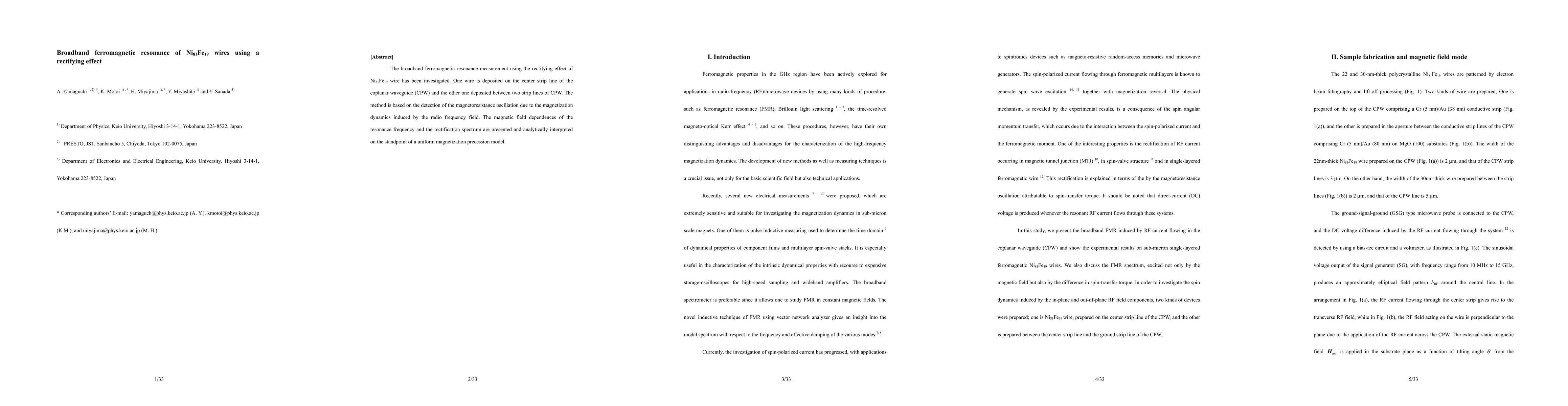 The broadband ferromagnetic resonance measurement using the rectifying effect of Ni81Fe19 wire has been investigated. One wire is deposited on the center strip line of the coplanar waveguide (CPW) and the other one deposited between two strip lines of CPW. The method is based on the detection of the magnetoresistance oscillation due to the magnetization dynamics induced by the radio frequency field. The magnetic field dependences of the resonance frequency and the rectification spectrum are presented and analytically interpreted on the standpoint of a uniform magnetization precession model.