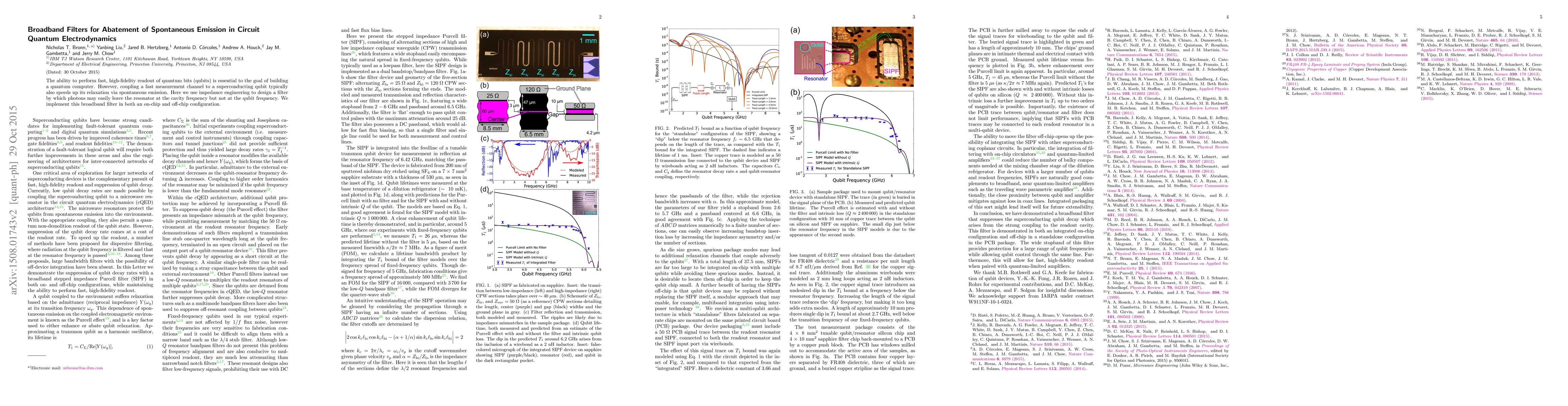 This paper presents a broadband filter designed to reduce spontaneous emission in superconducting qubits, enabling high-fidelity readout without accelerating relaxation. The filter is implemented in both on-chip and off-chip configurations to optimize quantum electrodynamics circuits.
