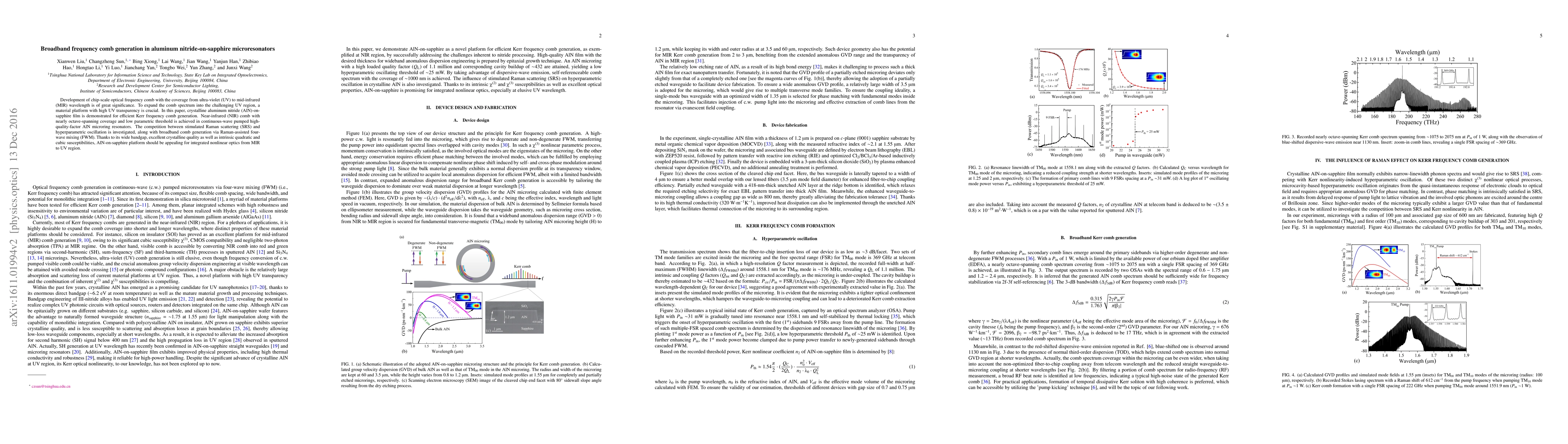 This paper demonstrates the use of crystalline aluminum nitride (AlN) on sapphire microresonators for broadband optical frequency comb generation, achieving near-infrared combs with octave-spanning coverage and low parametric threshold. The platform shows potential for integrated nonlinear optics extending from mid-infrared to ultraviolet wavelengths due to its high UV transparency and intrinsic nonlinear optical properties.