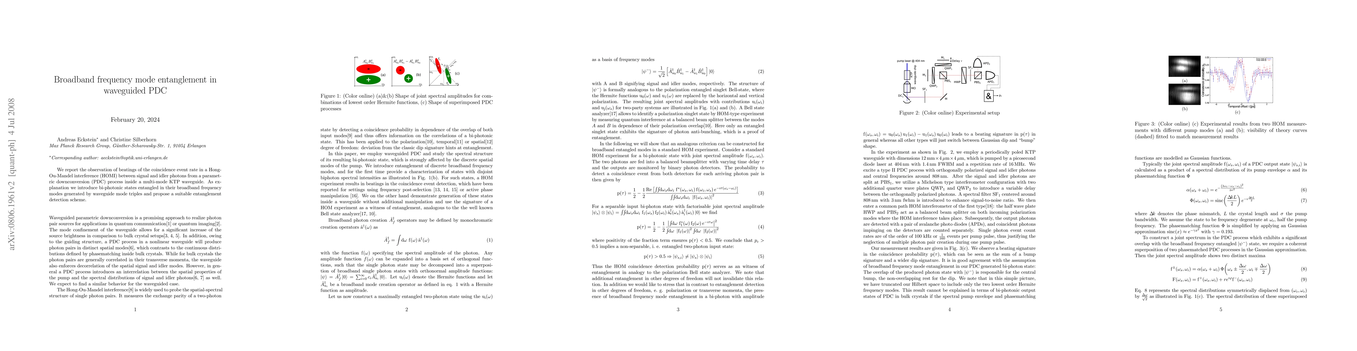 This paper reports the observation of Hong-Ou-Mandel interference in a multi-mode KTP waveguide, demonstrating broadband frequency mode entanglement in parametric downconversion. The study proposes a method for detecting such bi-photonic states entangled across their frequency modes.