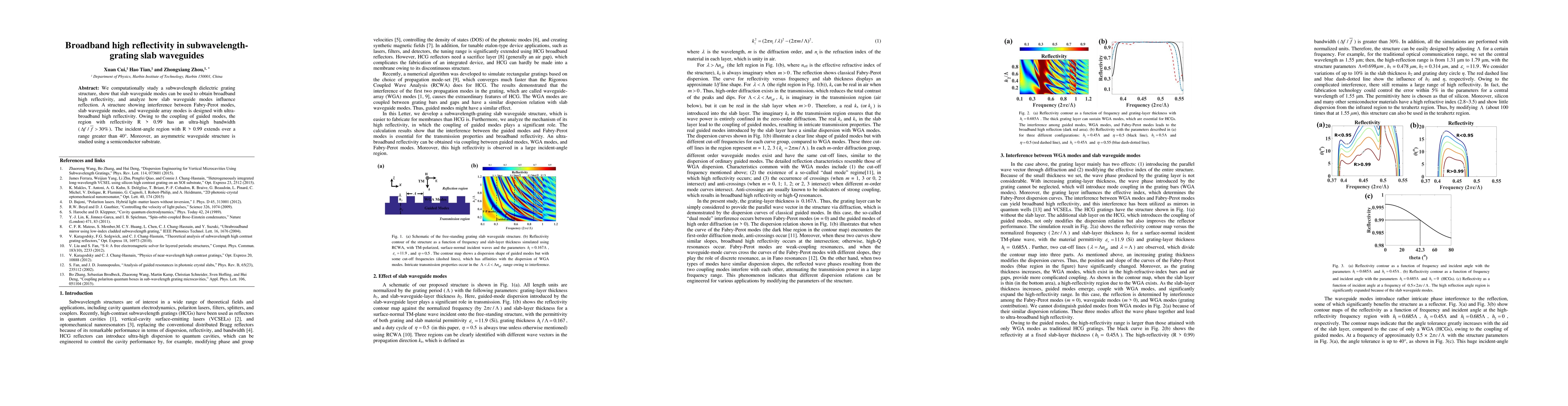 We computationally study a subwavelength dielectric grating structure, show that slab waveguide modes can be used to obtain broadband high reflectivity, and analyze how slab waveguide modes influence reflection. A structure showing interference between Fabry-Perot modes, slab waveguide modes, and waveguide array modes is designed with ultra-broadband high reflectivity. Owing to the coupling of guided modes, the region with reflectivity R > 0.99 has an ultra-high bandwidth ( {\Delta}f/f > 30%). The incident-angle region with R > 0.99 extends over a range greater than 40{\deg}. Moreover, an asymmetric waveguide structure is studied using a semiconductor substrate.