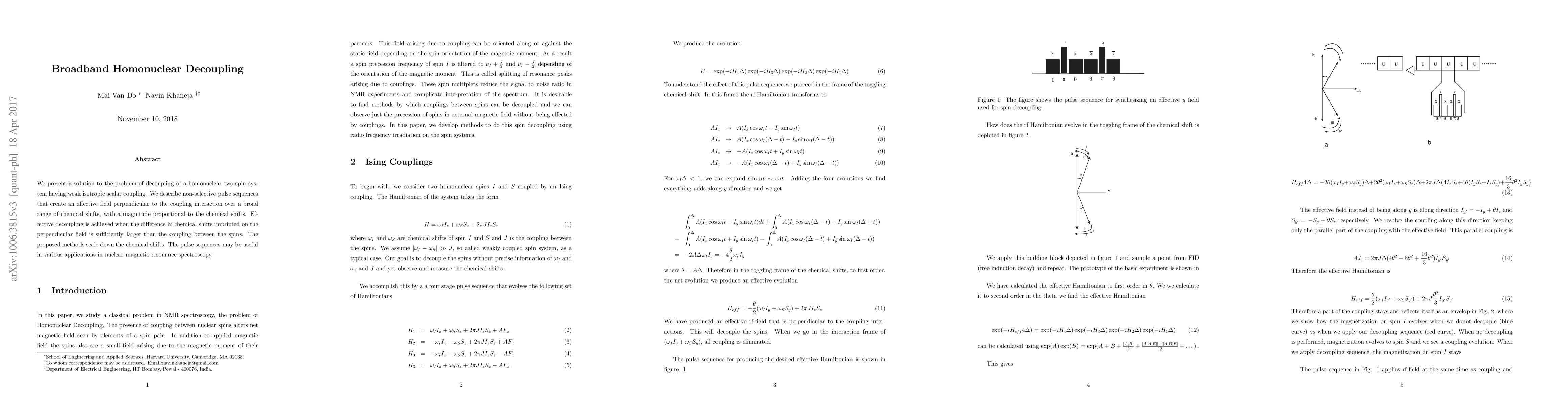 This paper introduces a pulse sequence for broadband decoupling in homonuclear two-spin systems, creating an effective field that suppresses coupling over a wide range of chemical shifts, enhancing NMR applications. The method relies on imprinting a chemical shift difference onto a perpendicular field to achieve effective decoupling.