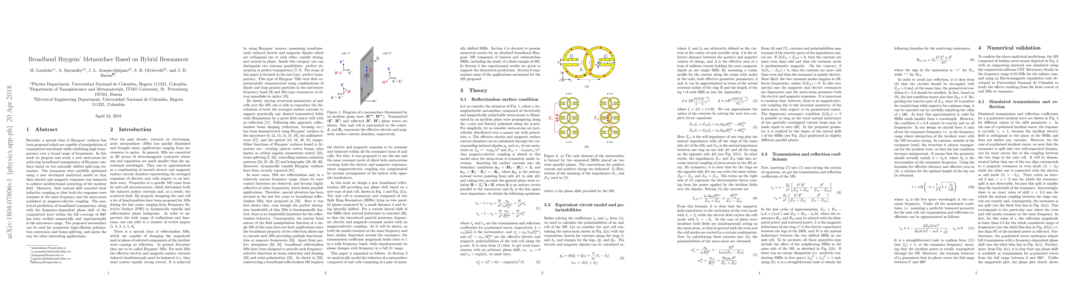 Recently, a special class of Huygens' surfaces has been proposed which are capable of manipulation of transmitted wavefronts while exhibiting high transparency over a broad range of frequencies. In this work we propose and study a new meta-atom for achieving broadband transparency of Huygens' surfaces based on two mutually shifted split-ring resonators. The resonators were carefully optimized using a new developed analytical model so that their electric and magnetic responses was balanced to achieve unidirectional scattering of the incident field. Moreover, their mutual shift canceled their inductive coupling so that both the responses were resonant at the same frequency and the meta-atom exhibited no magneto-electric coupling. The analytical prediction of broadband transparency along with the frequency-dependent phase shift of the transmitted wave within the full coverage of $360\degree$ has been verified numerically and experimentally in the microwave range. The proposed metasurface can be used for symmetric high-efficient polarization conversion and beam-splitting, and opens the way for other interesting applications.