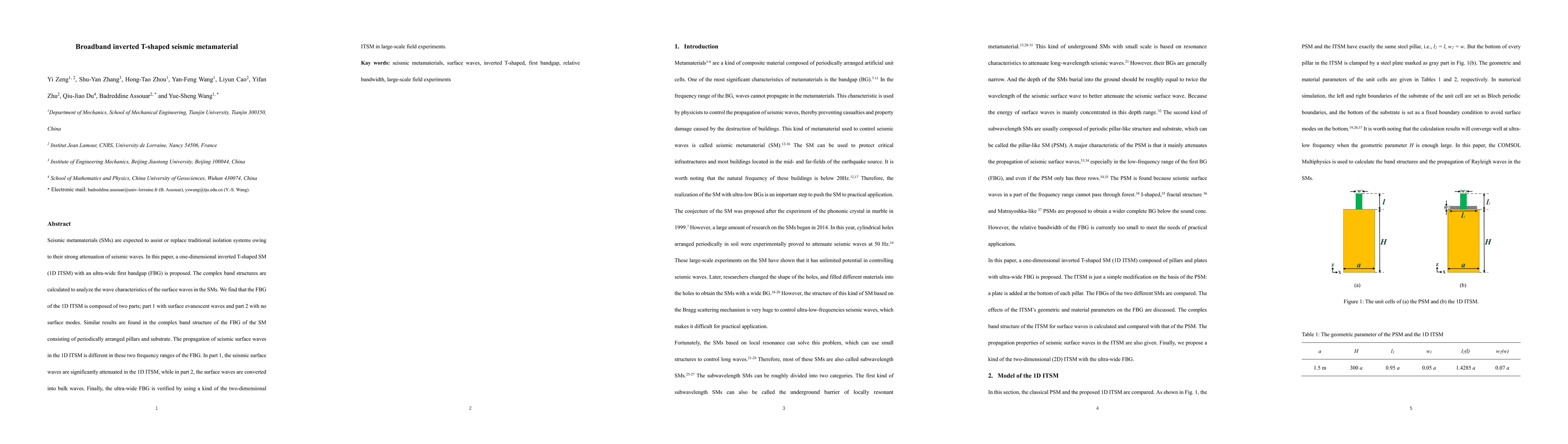 Seismic metamaterials (SMs) are expected to assist or replace traditional isolation systems owing to their strong attenuation of seismic waves. In this paper, a one-dimensional inverted T-shaped SM (1D ITSM) with an ultra-wide first bandgap (FBG) is proposed. The complex band structures are calculated to analyze the wave characteristics of the surface waves in the SMs. We find that the FBG of the 1D ITSM is composed of two parts; part 1 with surface evanescent waves and part 2 with no surface modes. Similar results are found in the complex band structure of the FBG of the SM consisting of periodically arranged pillars and substrate. The propagation of seismic surface waves in the 1D ITSM is different in these two frequency ranges of the FBG. In part 1, the seismic surface waves are significantly attenuated in the 1D ITSM, while in part 2, the surface waves are converted into bulk waves. Finally, the ultra-wide FBG is verified by using a kind of the two-dimensional ITSM in large-scale field experiments.