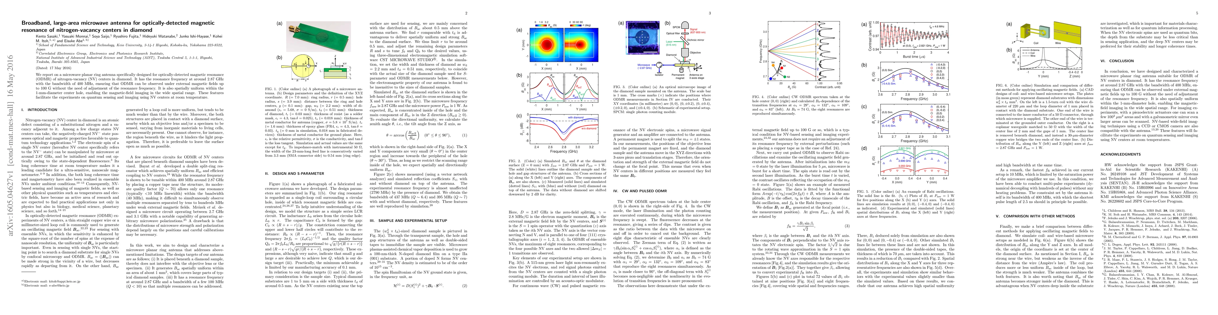 This paper presents a broadband microwave planar ring antenna designed for optically-detected magnetic resonance of nitrogen-vacancy centers in diamond, featuring a resonance frequency of 2.87 GHz and a 400 MHz bandwidth, enabling magnetic-field imaging over a wide spatial range without frequency adjustment.