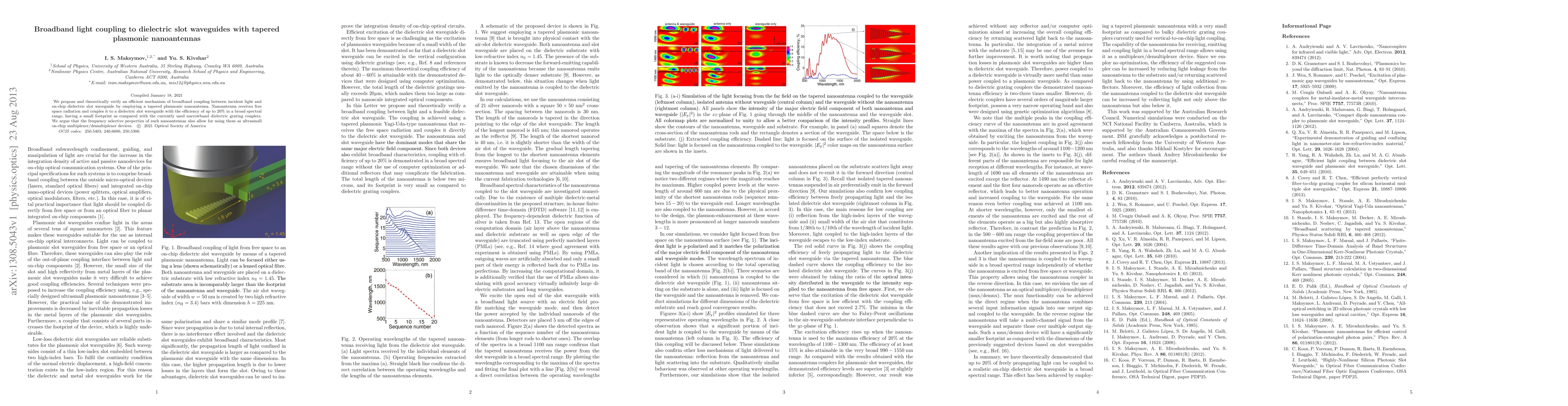 This research proposes an efficient broadband light coupling mechanism using tapered plasmonic nanoantennas to connect incident light to dielectric slot waveguides, achieving up to 20% efficiency over a wide spectrum. The method offers a smaller footprint compared to conventional narrowband couplers and suggests potential use as ultrasmall multiplexer/demultiplexer devices.