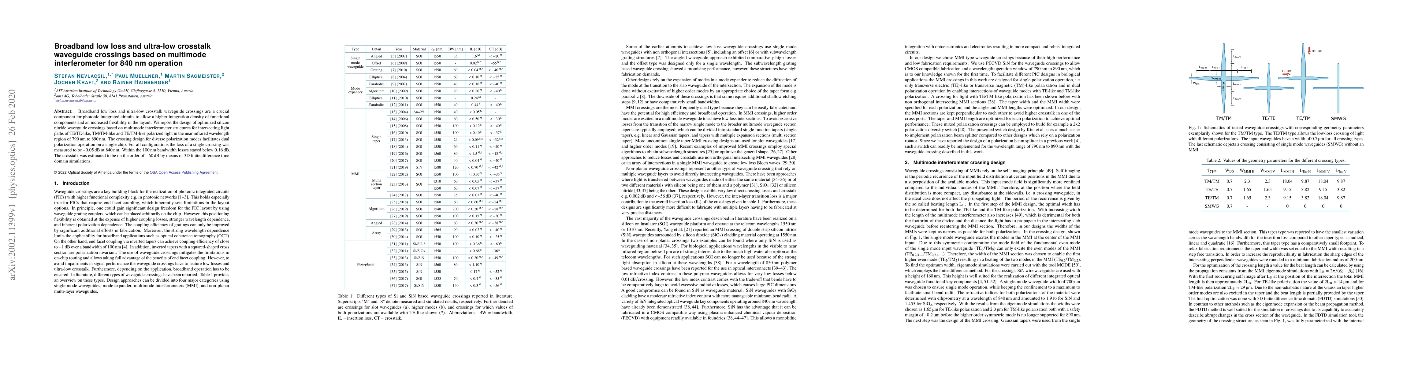 This paper presents an optimized silicon nitride waveguide crossing design based on multimode interferometer structures, achieving broadband low loss and ultra-low crosstalk for TE/TE-like, TM/TM-like, and TE/TM-like polarized light at 840 nm. The design supports dual polarization operation with a single crossing loss of 0.05 dB at 840 nm and below 0.16 dB over a 100 nm bandwidth, with crosstalk estimated at -60 dB.