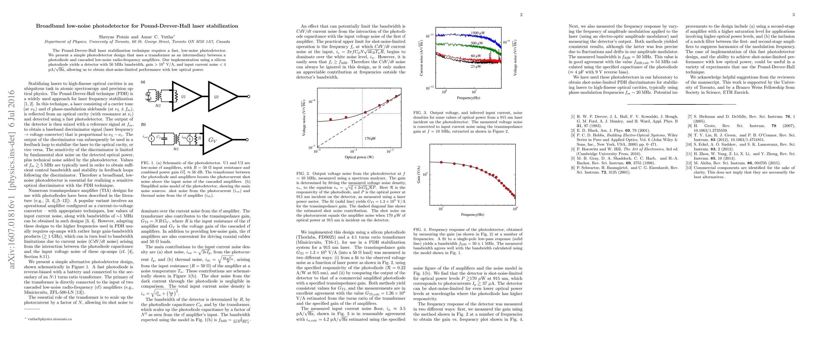 The research presents a broadband, low-noise photodetector design for Pound-Drever-Hall laser stabilization, featuring a transformer-based intermediary between a silicon photodiode and radio-frequency amplifiers, achieving 50 MHz bandwidth and shot-noise-limited performance with minimal optical power.