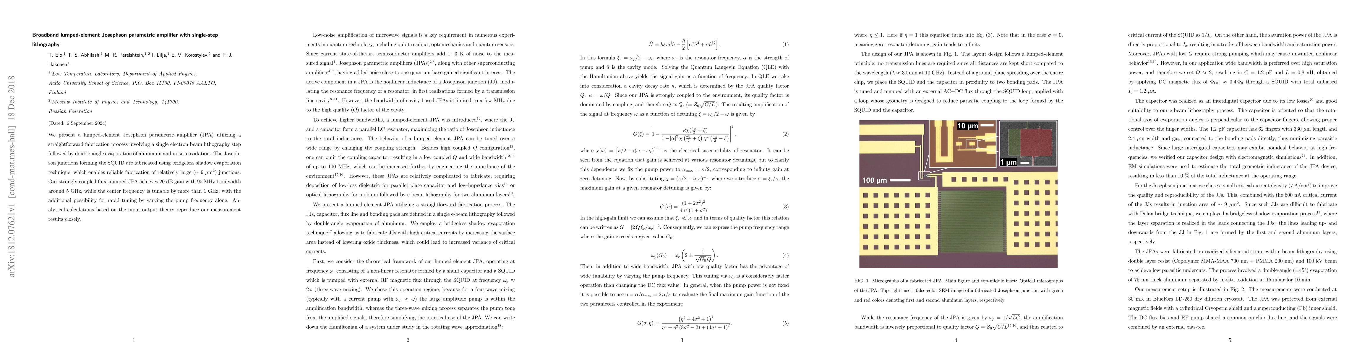 This paper describes a lumped-element Josephson parametric amplifier (JPA) fabricated using a single-step electron beam lithography and double-angle evaporation, achieving 20 dB gain with a 95 MHz bandwidth around 5 GHz. The device's center frequency is tunable over 1 GHz, with rapid tuning possible via pump frequency variation.