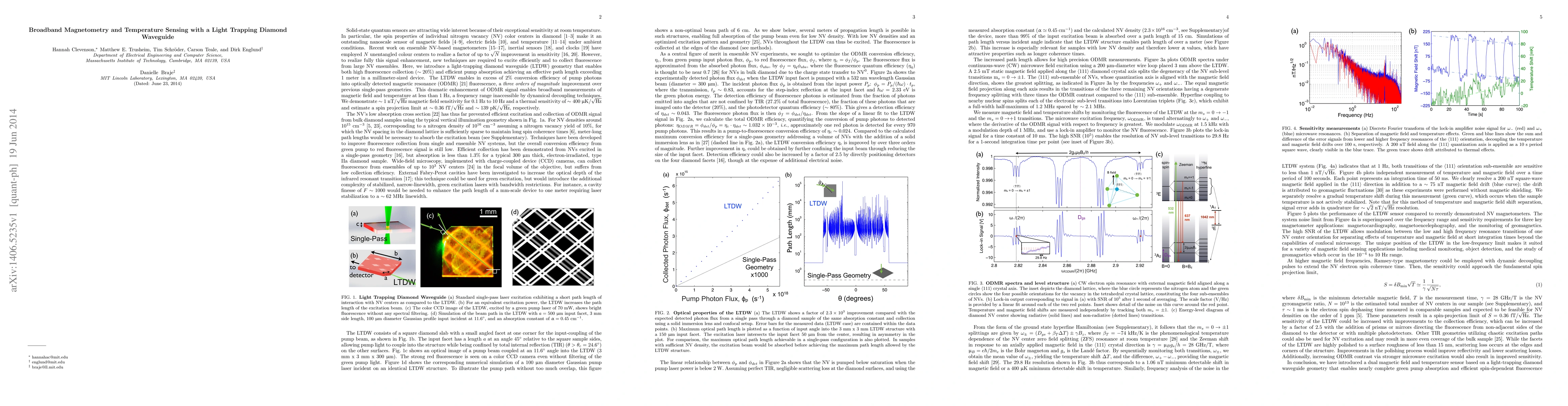 Solid-state quantum sensors are attracting wide interest because of their exceptional sensitivity at room temperature. In particular, the spin properties of individual nitrogen vacancy (NV) color centers in diamond make it an outstanding nanoscale sensor of magnetic fields, electric fields, and temperature, under ambient conditions. Recent work on ensemble NV-based magnetometers, inertial sensors, and clocks have employed $N$ unentangled color centers to realize a factor of up to $\sqrt{N}$ improvement in sensitivity. However, to realize fully this signal enhancement, new techniques are required to excite efficiently and to collect fluorescence from large NV ensembles. Here, we introduce a light-trapping diamond waveguide (LTDW) geometry that enables both high fluorescence collection ($\sim20\%$) and efficient pump absorption achieving an effective path length exceeding $1$ meter in a millimeter-sized device. The LTDW enables in excess of $2\%$ conversion efficiency of pump photons into optically detected magnetic resonance (ODMR) fluorescence, a \textit{three orders of magnitude} improvement over previous single-pass geometries. This dramatic enhancement of ODMR signal enables broadband measurements of magnetic field and temperature at less than $1$ Hz, a frequency range inaccessible by dynamical decoupling techniques. We demonstrate $\sim 1~\mbox{nT}/\sqrt{\mbox{Hz}}$ magnetic field sensitivity for $0.1$ Hz to $10$ Hz and a thermal sensitivity of $\sim 400 ~\mu\mbox{K}/\sqrt{\mbox{Hz}}$ and estimate a spin projection limit at $\sim 0.36$ fT/$\sqrt{\mbox{Hz}}$ and $\sim 139~\mbox{pK}/\sqrt{\mbox{Hz}}$, respectively.