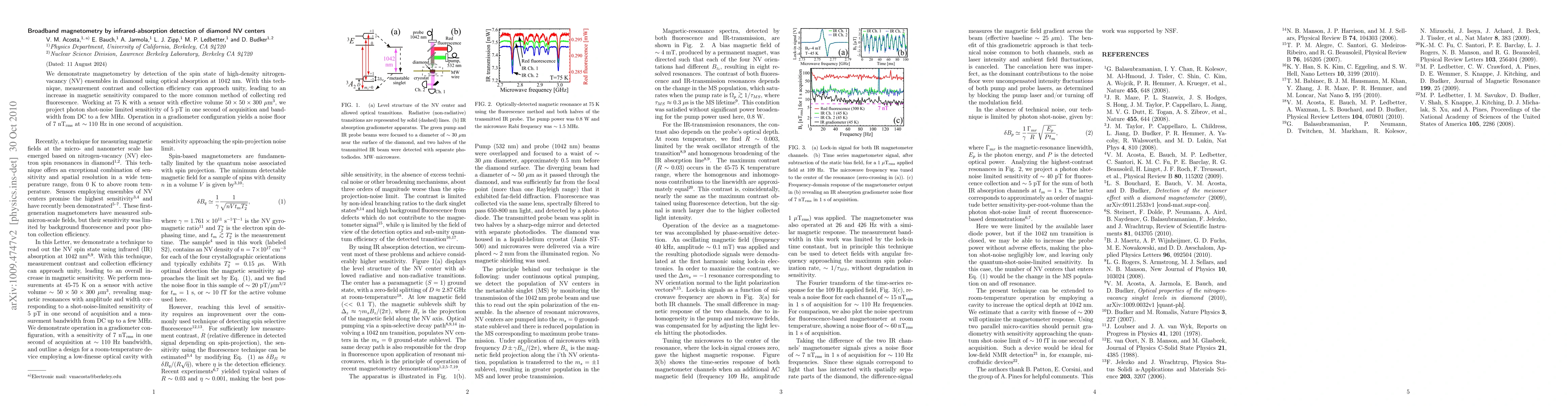 This paper presents a novel broadband magnetometry technique using infrared absorption detection of nitrogen-vacancy centers in diamond, achieving near-unity measurement contrast and collection efficiency, resulting in enhanced magnetic sensitivity compared to fluorescence-based methods, with projected sensitivity of 5 pT in one second.