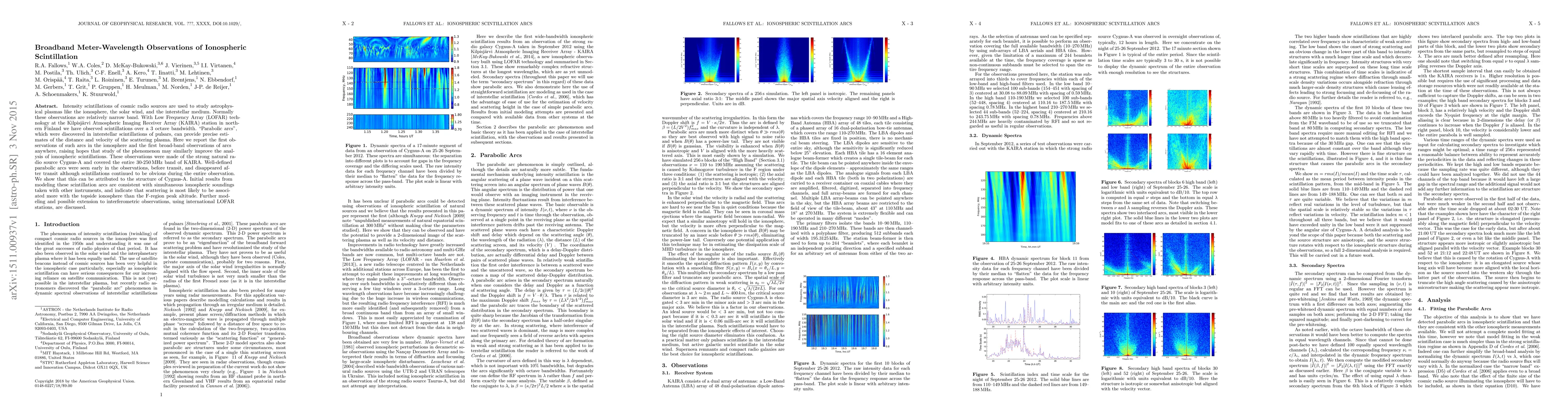This paper reports the first broadband observations of "parabolic arcs" in ionospheric scintillation using LOFAR technology, revealing insights into the scattering plasma's distance and velocity. The study, conducted over a 3 octave bandwidth, suggests that scattering is most likely associated with the topside ionosphere rather than the F-region peak.