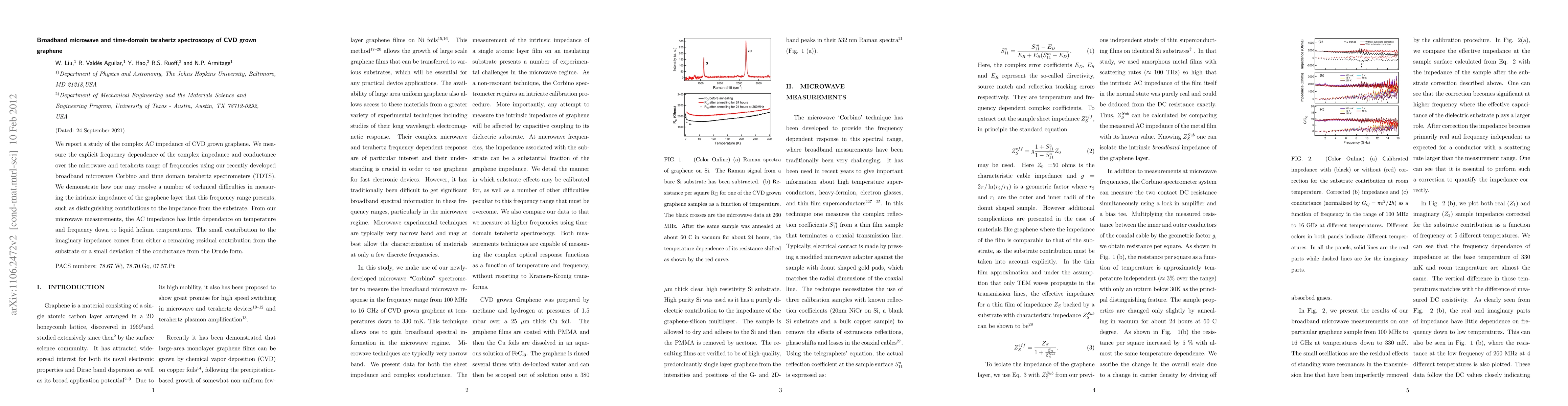 We report a study of the complex AC impedance of CVD grown graphene. We measure the explicit frequency dependence of the complex impedance and conductance over the microwave and terahertz range of frequencies using our recently developed broadband microwave Corbino and time domain terahertz spectrometers (TDTS). We demonstrate how one may resolve a number of technical difficulties in measuring the intrinsic impedance of the graphene layer that this frequency range presents, such as distinguishing contributions to the impedance from the substrate. From our microwave measurements, the AC impedance has little dependance on temperature and frequency down to liquid helium temperatures. The small contribution to the imaginary impedance comes from either a remaining residual contribution from the substrate or a small deviation of the conductance from the Drude form.
