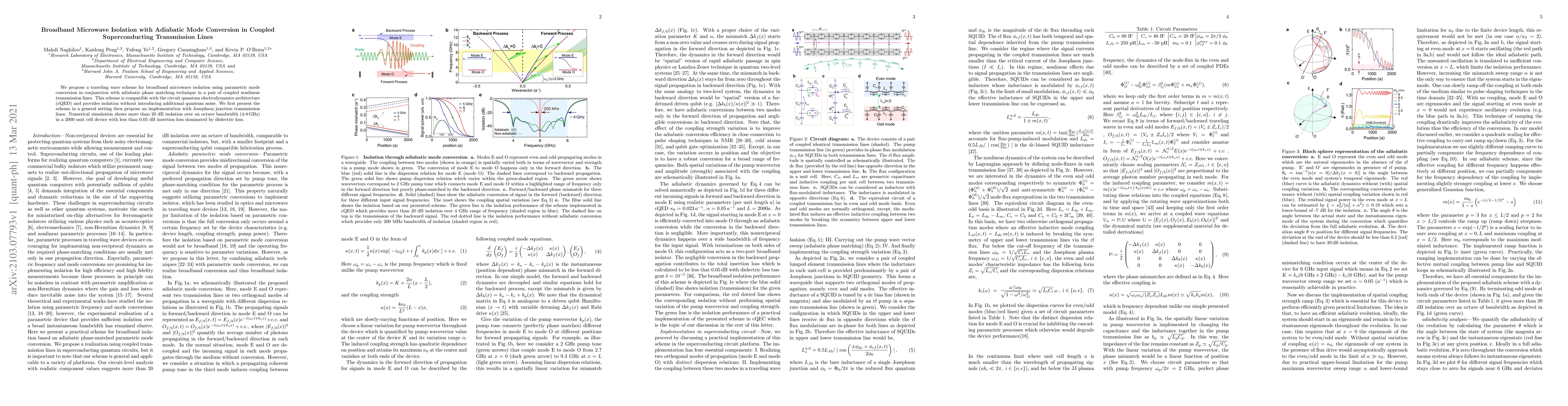 This paper proposes a broadband microwave isolation scheme using adiabatic mode conversion in coupled superconducting transmission lines, achieving over 20 dB isolation from 4-8 GHz with minimal insertion loss, suitable for circuit quantum electrodynamics systems without adding quantum noise.