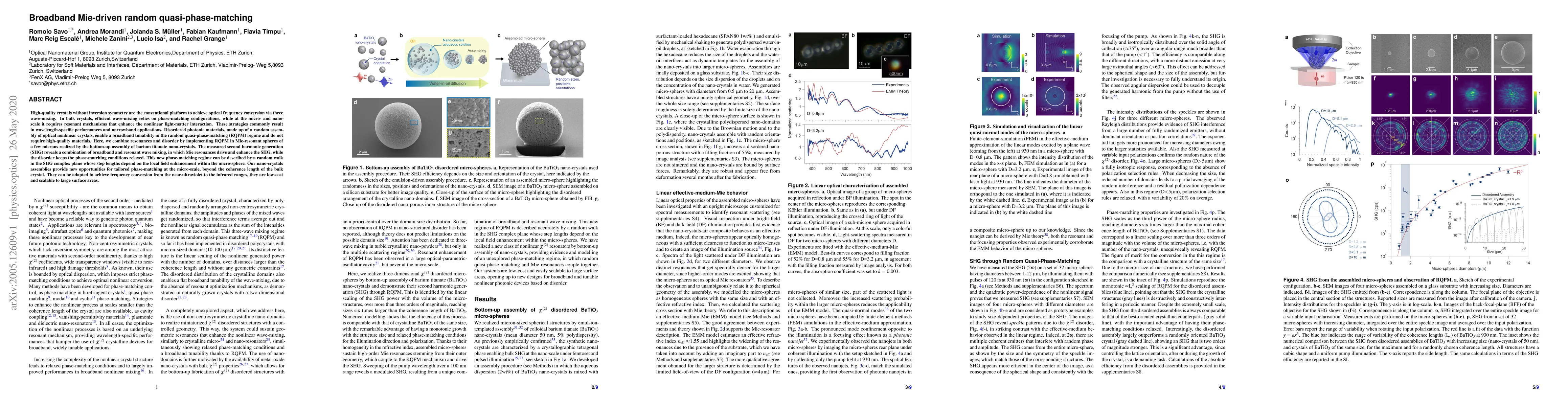 This paper explores broadband optical frequency conversion using random quasi-phase-matching (RQPM) in Mie-resonant spheres assembled from barium titanate nano-crystals. The study demonstrates enhanced second harmonic generation (SHG) through a combination of Mie resonances and disorder, offering a scalable, low-cost solution for broadband frequency conversion across various optical ranges.