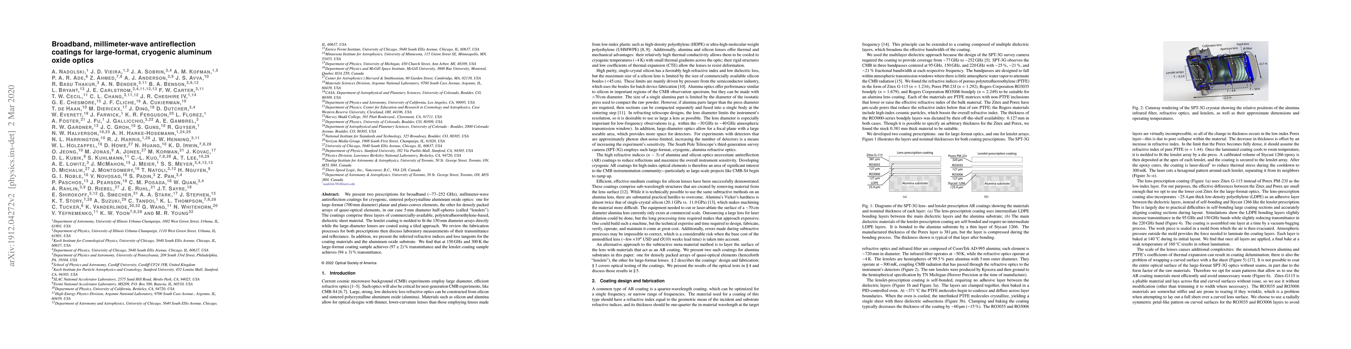 This paper proposes two broadband millimeter-wave antireflection coatings for cryogenic aluminum oxide optics, one for large-format lenses and another for lenslet arrays. The coatings use three layers of polytetrafluoroethylene-based dielectric material, achieving high transmittance levels of 97% and 94% respectively.