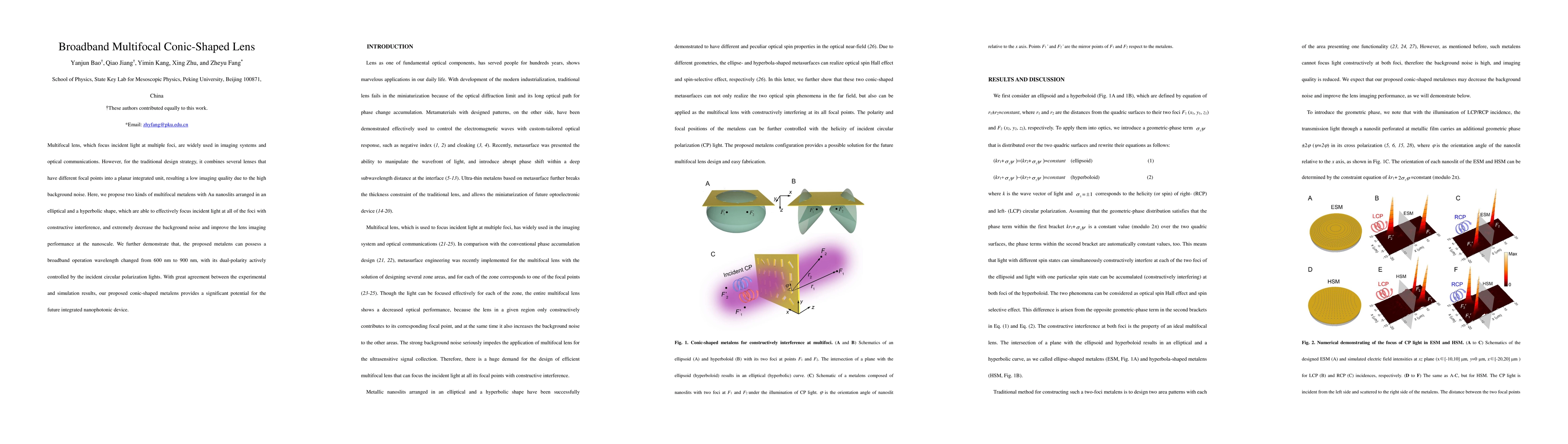 This paper proposes conic-shaped metalenses made from Au nanoslits that focus incident light at multiple foci with reduced background noise, enhancing imaging quality. The metalens operates broadly from 600 nm to 900 nm and can be actively controlled by circularly polarized light, showing great potential for integrated nanophotonic devices.