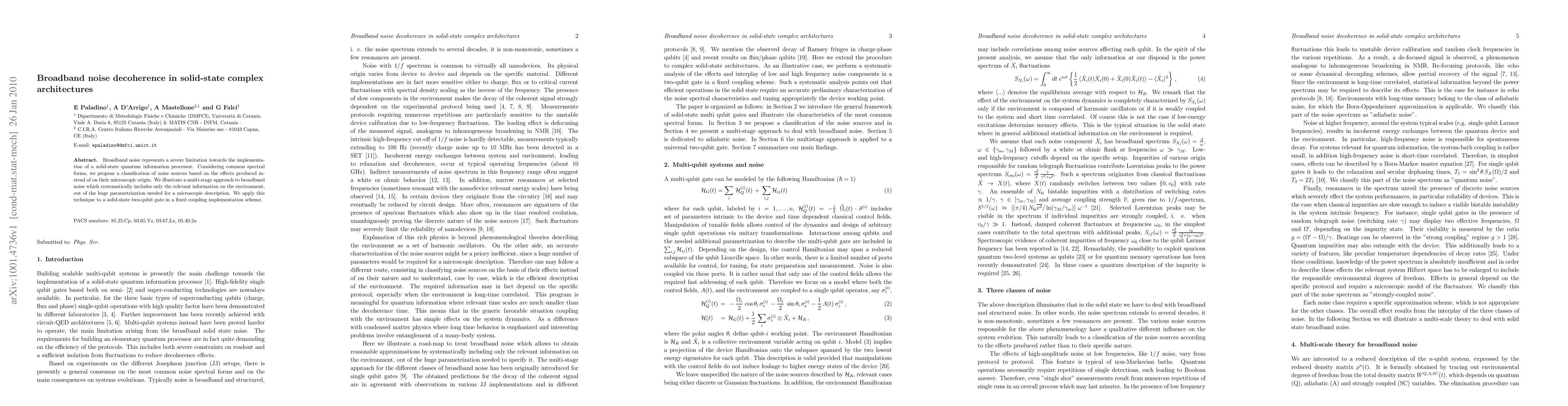 This research proposes a classification of broadband noise sources in solid-state quantum systems based on their effects rather than microscopic origins, and introduces a multi-stage approach to manage such noise, applied to a two-qubit gate in a fixed coupling implementation. The aim is to systematically include only relevant environmental information to mitigate noise for quantum information processing.