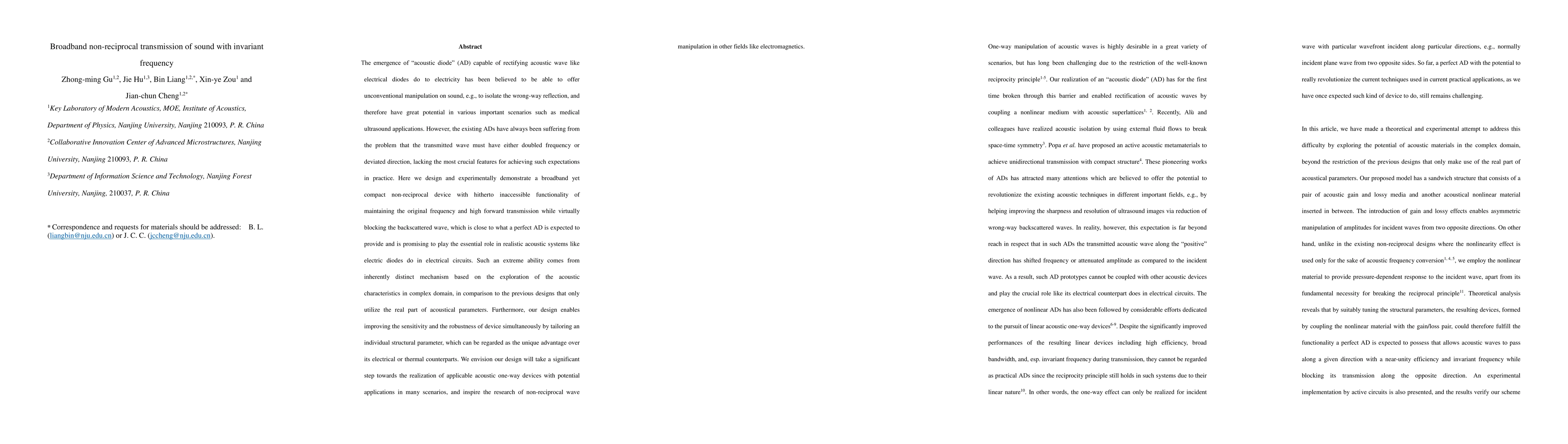 Researchers have developed a broadband non-reciprocal device that can transmit sound with an invariant frequency while blocking backscattered waves, offering promising potential for various applications including medical ultrasound.
